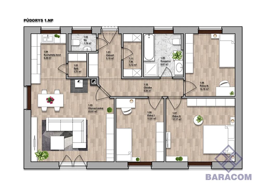 Nabízíme výstavbu rodinného domu typu „Bungalov“ na klíč. Cena je pouze za uvedený RD. V klidné části na okraji města Tachov v plzeňském kraji. Podlahová plochu domu nabízí 96m2 o velikosti 4+kk. Dům je členěn na kuchyňskou část s prostorným obývacím pokojem, ložnicí, dva pokoje, technickou místnost, koupelnu s WC a samostatným WC. Měrná hodnota energetické náročnosti domů je ve skupině B = velmi úsporná. Vytápění rodinného domů je zajištěno tepelným čerpadlem (voda - vzduch). Minimální ztrátu tepla bude zajišťovat rekuperace vzduchu. Dům bude napojen na nové přípojky inženýrských sítí (elektřina, voda a tlaková kanalizace). Možnost výběru obkladů, interiérových dveří a podlah v našich klientských centrech. Od vydaného stavebního povolení můžete do 10 měsíců bydlet. Dále nabízíme možnost zprostředkování nákupu pozemků v této lokalitě. V naší nabídce naleznete pozemky s výměrou od 459m2 do 603m2. V lokalitě jsou nově zbudované inženýrské sítě. Místo výstavby je velmi klidné. Okolní zástavbu tvoří nově vybudované rodinné domy. Foto je ilustrativní.