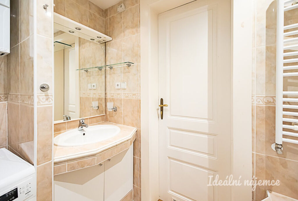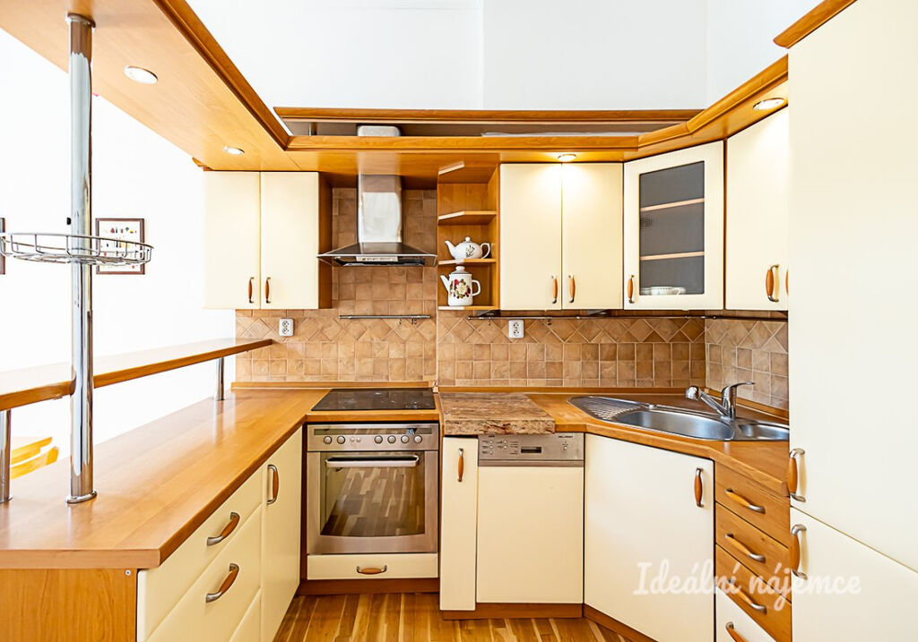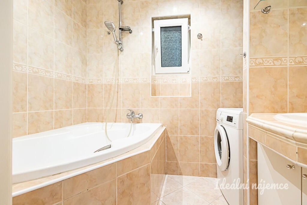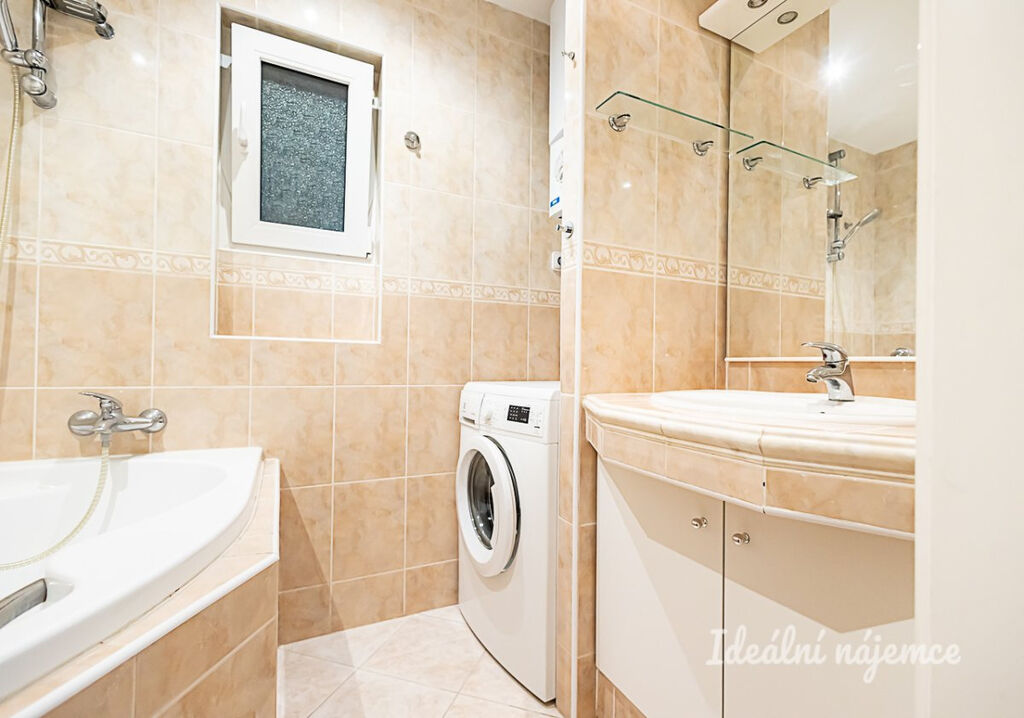 Byt je plně vybavený, takže se můžete ihned nastěhovat bez starostí. Kuchyně nabízí lednici s mrazákem, myčku, elektrickou troubu, digestoř a praktický jídelní kout. Obývací pokoj je prostorný a útulný, s pohodlným gaučem, konferenčním stolkem a úložnými prostory. Ložnice je vybavena manželskou postelí a praktickou policí. Koupelna disponuje vanou, umyvadlem, koupelnovou skříňkou a pračkou, toaleta je samostatná.