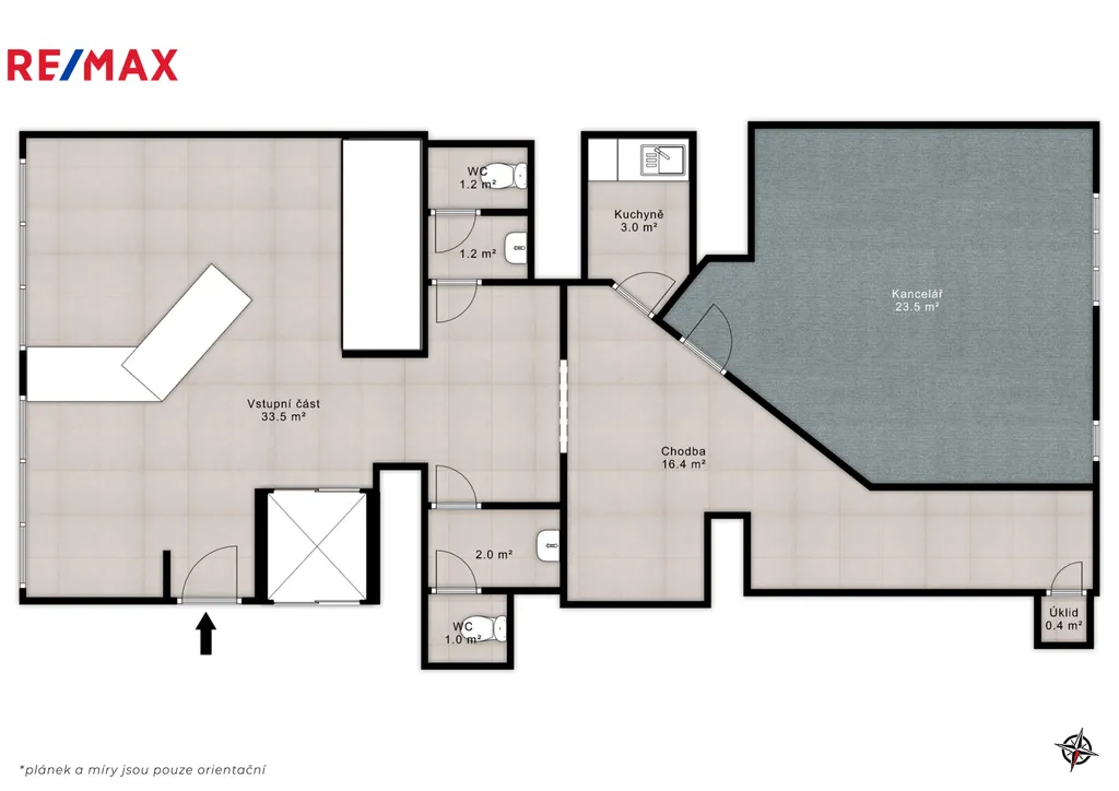 Jednotka je tvořena rozlehlým víceúrovňovým vstupním prostorem s recepcí (33,5 m2), samostatnou kanceláří (23,5 m2), kuchyňským koutem (3 m2) přístupným z prostorné chodby (16,4 m2), ze které je dále přístup na dvě oddělené toalety (2,4 m2 a 3 m2). Prostor s recepcí je situován směrem k magistrále, kancelář má výhled do klidného vnitrobloku; okna opatřena žaluziemi.