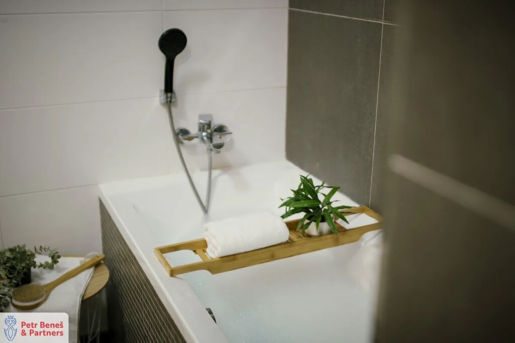 Skvěle řešená koupelna má jak vanu, tak sprchový kout, takže konečně žádné věčné dohady, zda sprchu či vanu. Každý si prostě vybere, co mu zrovna vyhovuje.