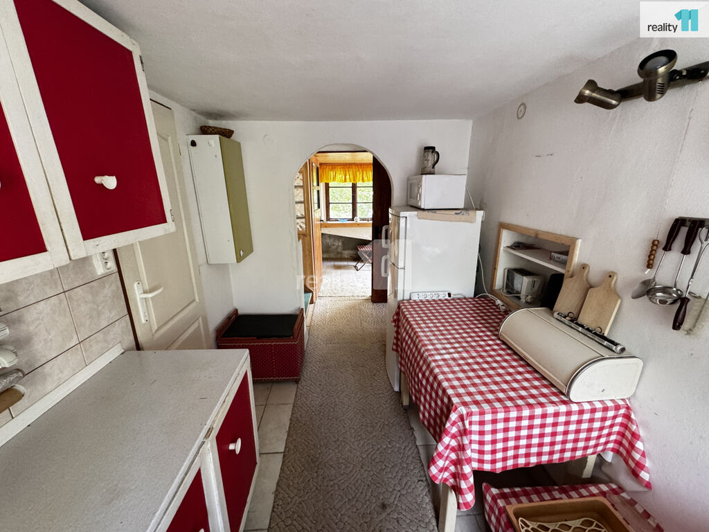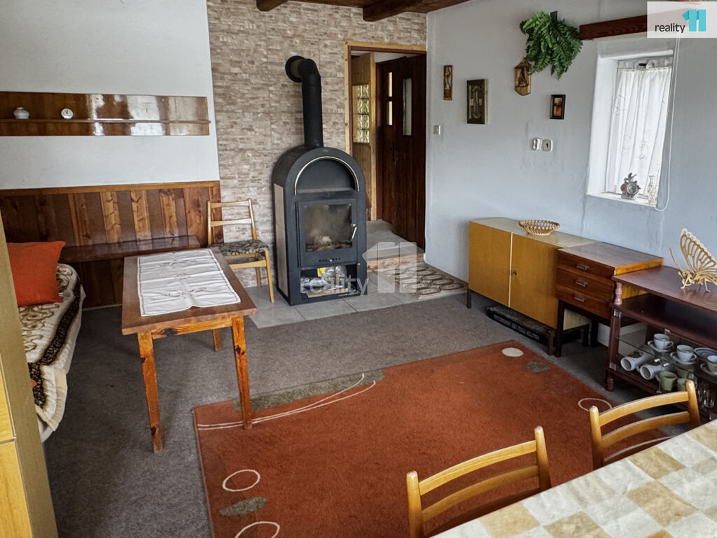 Přízemí: veranda s komorou, hlavní obytná místnost s krbovými kamny a nádherným výhledem na přehradu, kuchyně se sporákem na PB, linkou, lednicí a stolem. Z kuchyně se vchází do koupelny se sprchovým koutem, umyvadlem a WC.