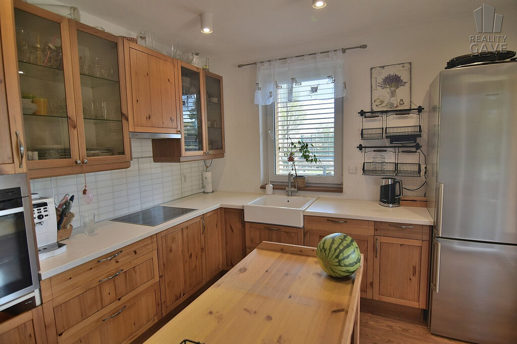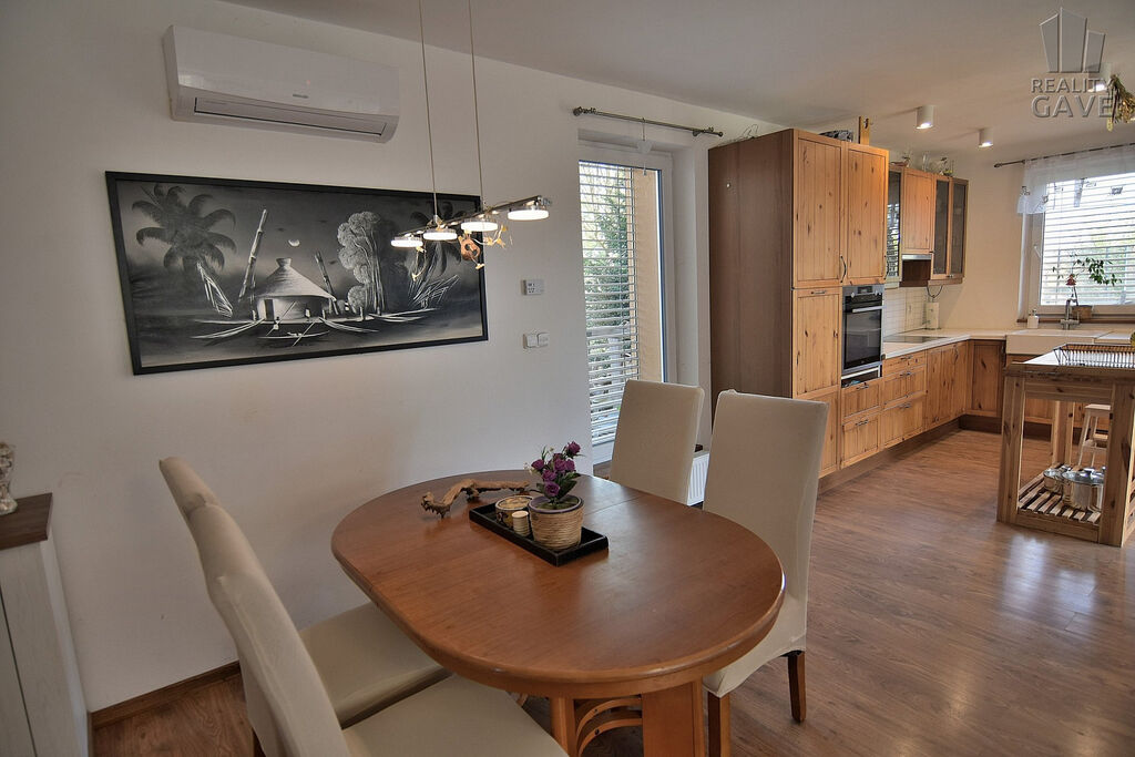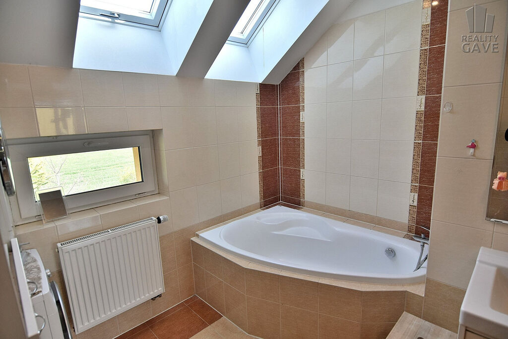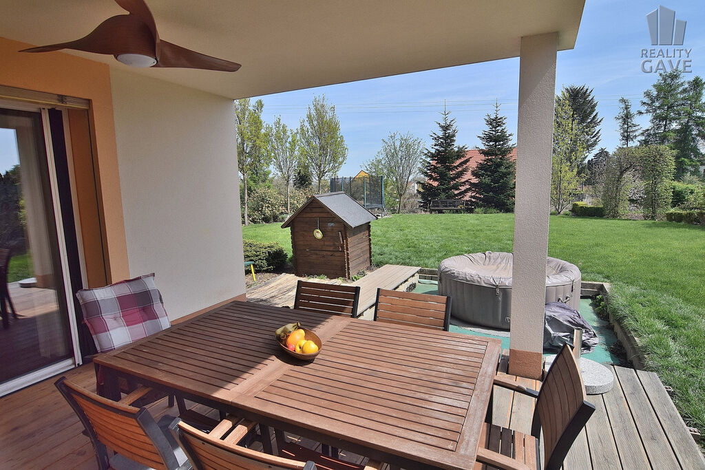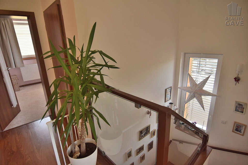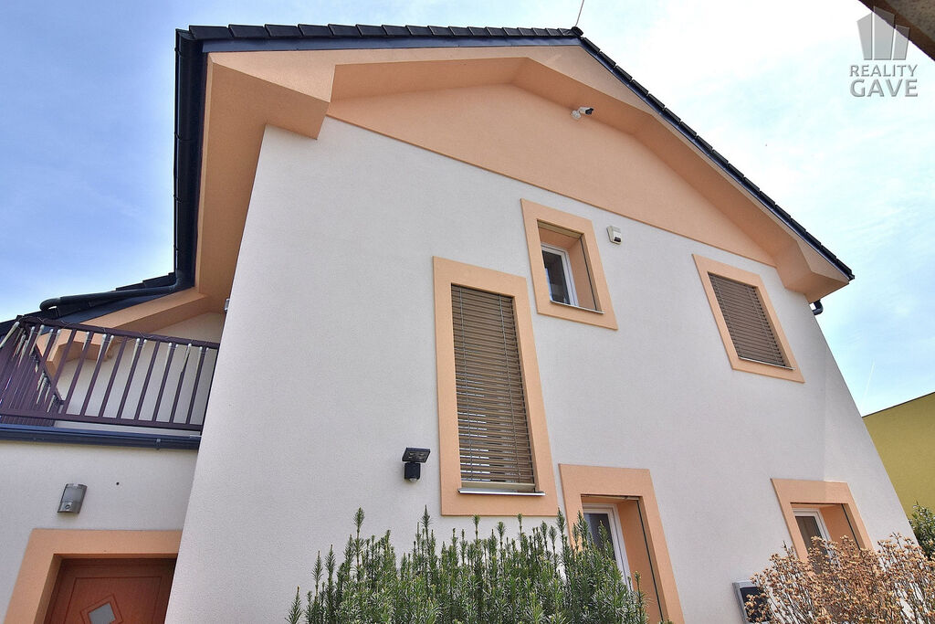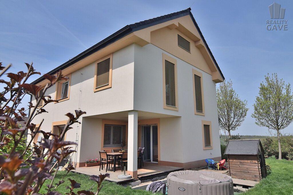 Stav a vybavení: Objekt je zateplen, fasáda je silikátová omyvatelná Baumit. Do domu jsou přivedeny všechny inženýrské sítě. Topení: plynovým kondenzačním kotlem do radiátorů a částečně do podlah. Střecha je sedlová s betonovou šedou taškou, okna jsou plastová s izolačními trojskly a jsou vybavena venkovními žaluziemi. Ve všech pokojích jsou nainstalovány vnitřní invertorové klimatizace (zn. Sinclair) – v létě chladí, v zimě topí. Objekt je chráněn elektronickým zabezpečovacím systemem s kamerami + dveřní interkom. Po celém pozemku a zahradě je vyveden rozvod vody a elektřiny a pro závlahu zeleně a travnaté plochy slouží automaticky řízený závlahový systém Hunter s 25 sprinklery. Venkovní PIR osvětlení. Z kuchyně je třemi kroky přístupná krytá terasa pod konstrukcí horního patra s posezením a s výhledem na celou zahradu. V domě je dostatek úložných prostor (vestavěné skříně), 2 šatny a zpevněné pochozí prostory půdy – 40 m².