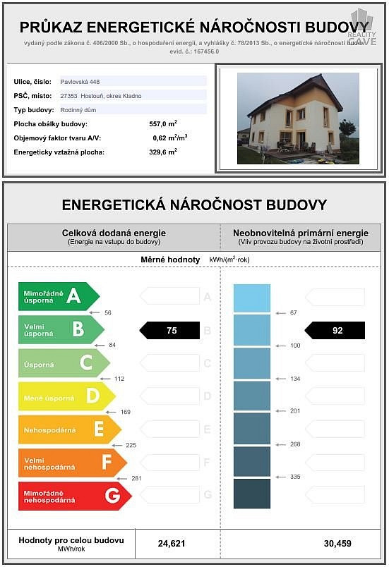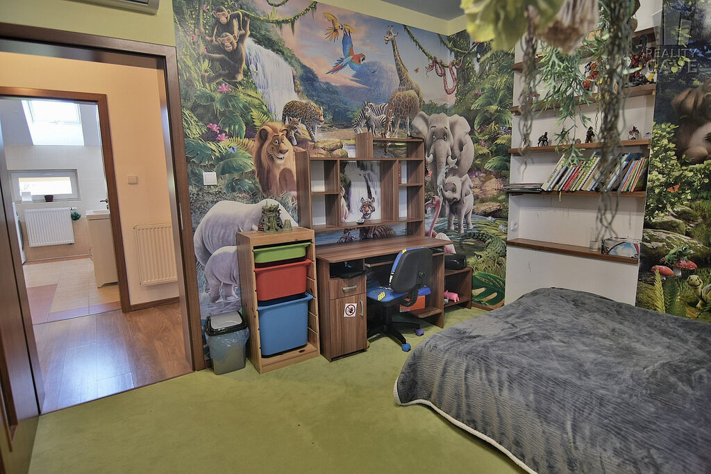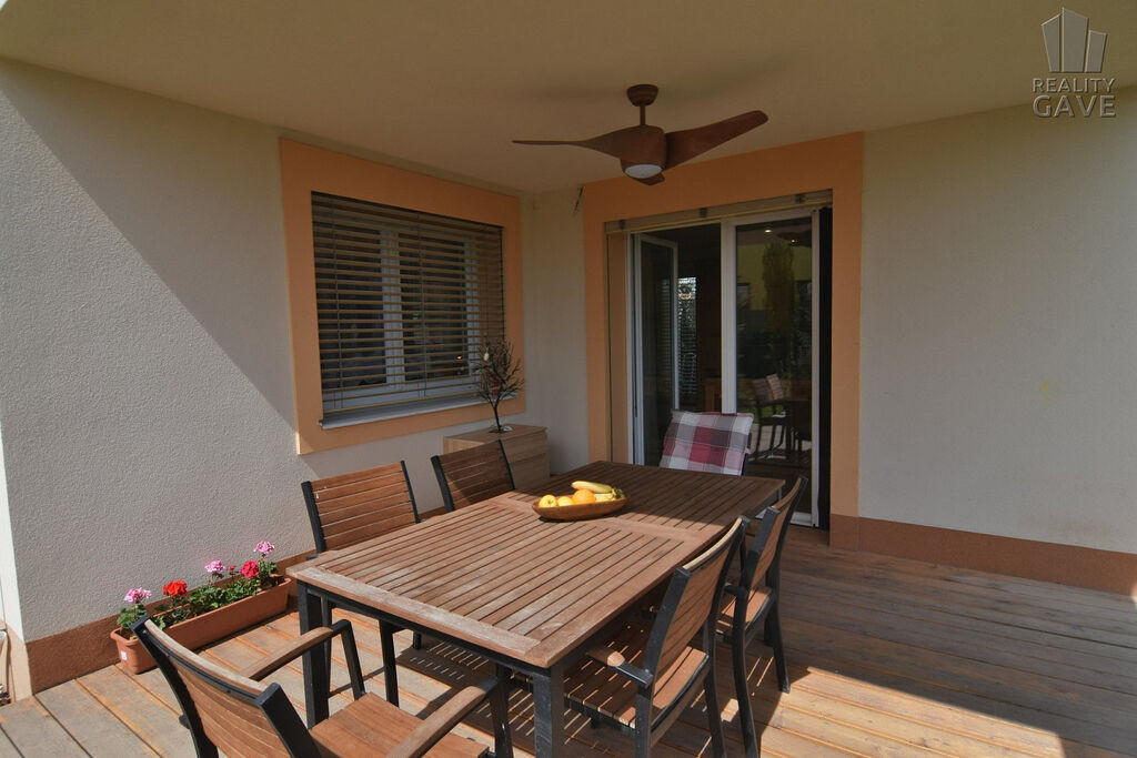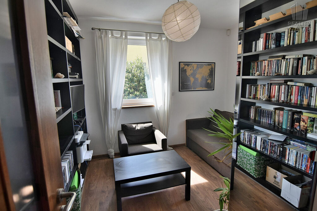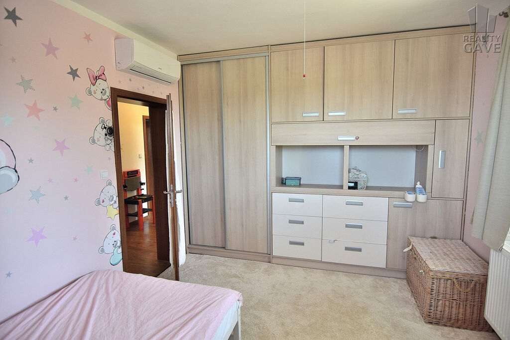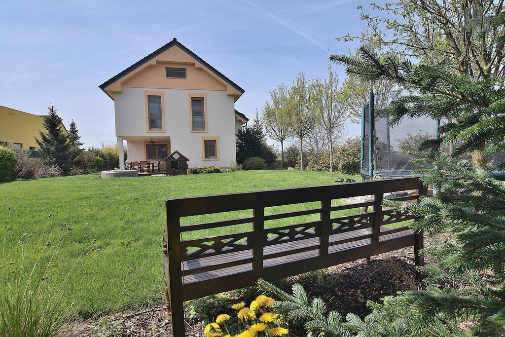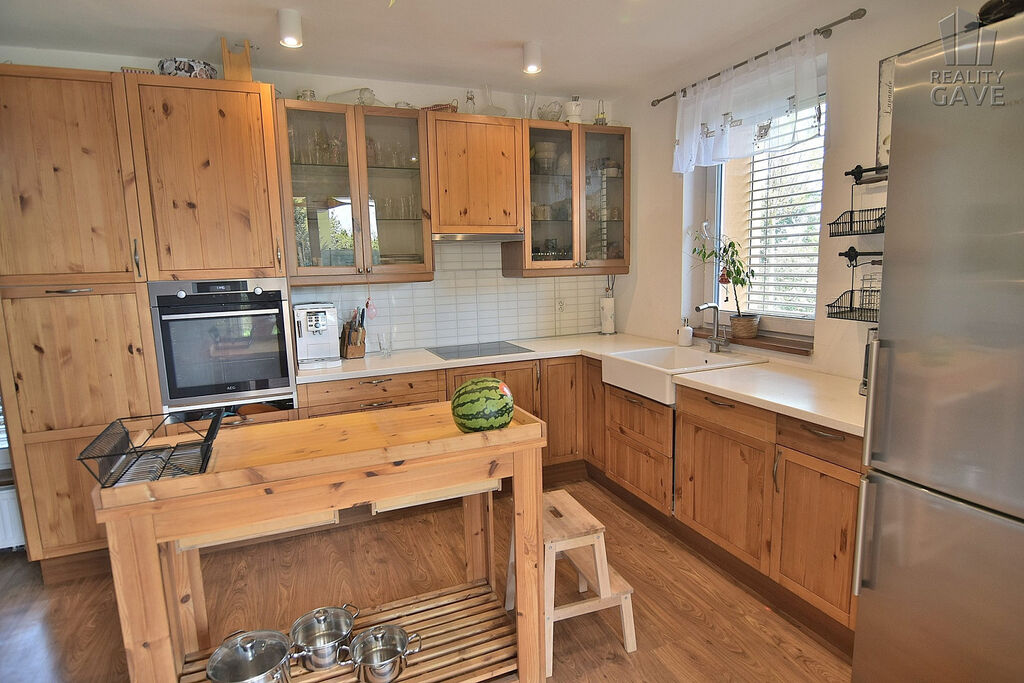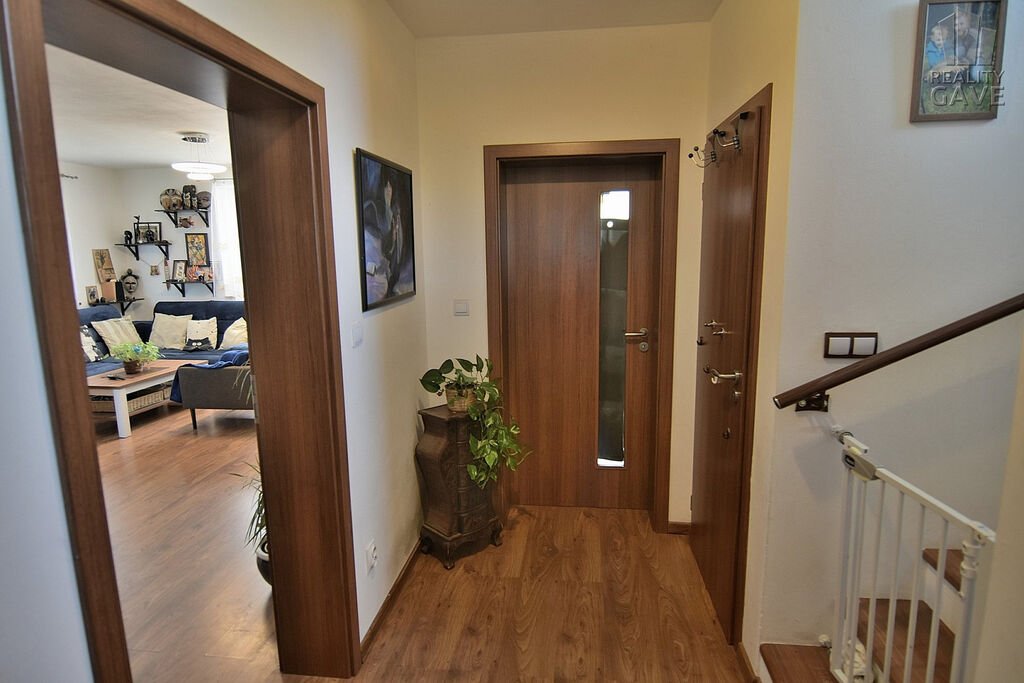 Stav a vybavení: Objekt je zateplen, fasáda je silikátová omyvatelná Baumit. Do domu jsou přivedeny všechny inženýrské sítě. Topení: plynovým kondenzačním kotlem do radiátorů a částečně do podlah. Střecha je sedlová s betonovou šedou taškou, okna jsou plastová s izolačními trojskly a jsou vybavena venkovními žaluziemi. Ve všech pokojích jsou nainstalovány vnitřní invertorové klimatizace (zn. Sinclair) – v létě chladí, v zimě topí. Objekt je chráněn elektronickým zabezpečovacím systemem s kamerami + dveřní interkom. Po celém pozemku a zahradě je vyveden rozvod vody a elektřiny a pro závlahu zeleně a travnaté plochy slouží automaticky řízený závlahový systém Hunter s 25 sprinklery. Venkovní PIR osvětlení. Z kuchyně je třemi kroky přístupná krytá terasa pod konstrukcí horního patra s posezením a s výhledem na celou zahradu. V domě je dostatek úložných prostor (vestavěné skříně), 2 šatny a zpevněné pochozí prostory půdy – 40 m².
