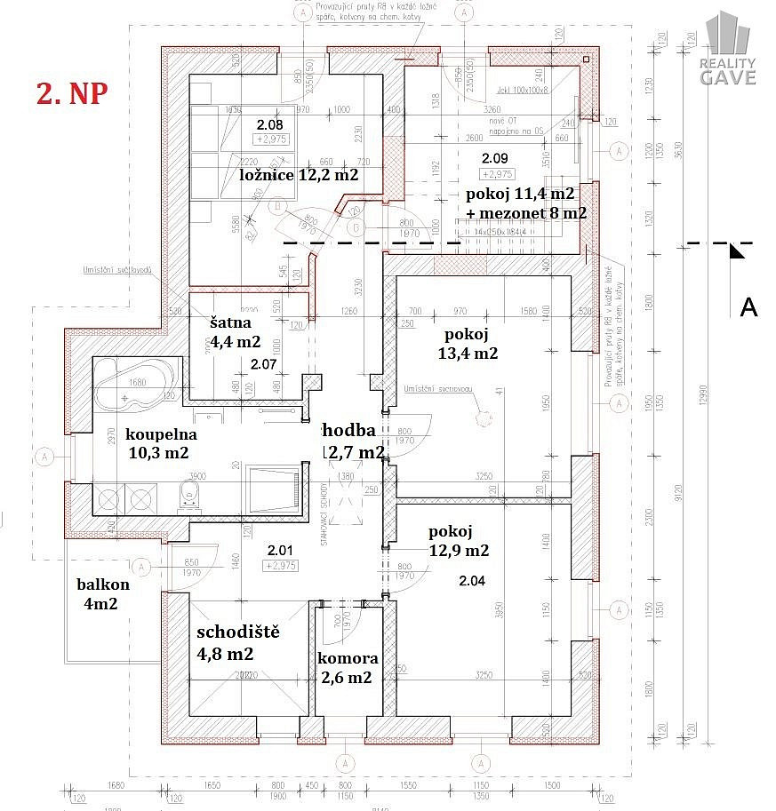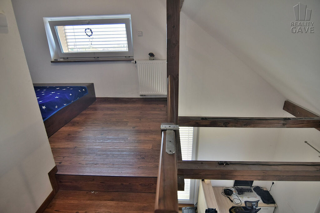 2. NP – 4 pokoje, velká koupelna (sprcha i rohová vana), komora, 2x samostatná místnost šatna, chodba, balkon
