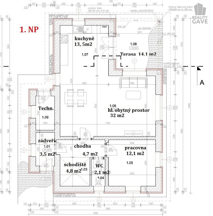 1. NP – hlavní obytný prostor s kuchyní, pracovna, malá koupelna (sprcha), sklad, zádveří, chodba, terasa