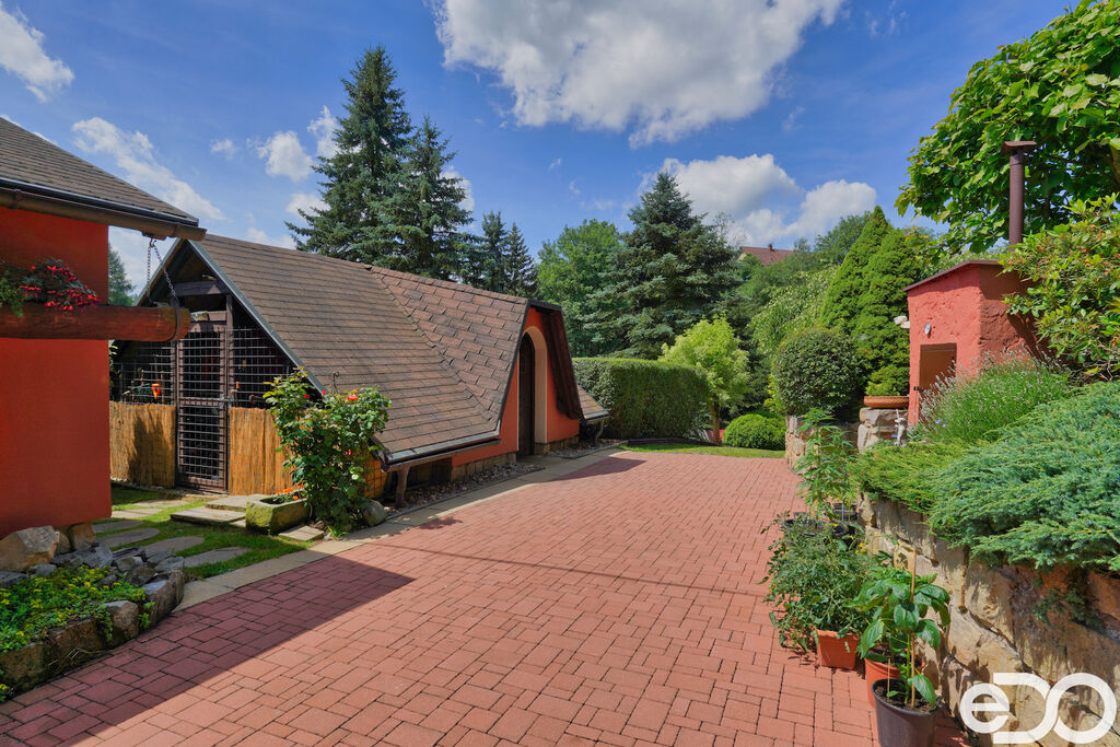 V exkluzivním zastoupení nabízím k prodeji rodinný dům umístěný v intravilánu obce Radeč nedaleko města Úpice. Ač se dům nachází nedaleko hlavní silnice, jeví se jako oáza klidu a pohody. Dům postaven ze základního stavebního materiálu a tím je kámen. Pevný, jistý a všestranný kámen vévodí v této nemovitosti obložením stavby. Stavba na bydlení a členitá zahrada-opečována pečlivou majitelkou. Vstupujeme branou na dálkové ovládání na příjezdové cestě, která vede do kopce až k obytné části domu. U kované brány je dvojitá garáž taktéž na dálkové ovládání - z toho vyplývá, že v zimním období není váš automobil pod obyčejným přístřeškem ale v teplotním komfortu. Travnaté plochy jsou pravidelně sekány a spojují několik odpočinkových a relaxačních zón. V pravo, cestou vedoucí za dům se nachází dřevník, sklad a plynová nádrž, která je jistotou nízkých nákladů na dům v zimním období. Na straně levé najdeme chodníky vedoucí k nejoblíbenější části celé nemovitosti-bazénu o hloubce 1.6m a délce 4m se stavbou pro pozvané hosty, kteří tu mohou i přespat. Dominantou této části je krásné jezírko s rybičkami. Vrátíme-li se od bazénu zpět k domu, potkáte cestou záhonky, tuje, smrkový porost, udírnu a dalším napojovacím chodníčkem se dostanete k luxusní pergole pro 10-20osob. Opačným směrem od bazénu se dostanete k dílně, která je obložená OSB deskami, skladem pro různá nářadí, která potřebujete nezbytně k udržování zahrady, bazénu a nakonec i domu. Hlavní budova kde jsou nejvíce obývané části a to kuchyně s podlahovým topením, obývací pokoj s velkou knihovnou a s krásným historický kachlovým krbem. Okna oblouková, dřevěné trámy na stropě, kovaný lustr jasně prozradí, že stojí za to tuto nemovitost vidět osobně! Z obývacího pokoje se dostanete na chodbu v nichž najdete koupelnu, masážní sprchový kout, záchod a úložný prostor. Po dřevěných schodech do patra najdete další 3 pokoje s krásnými výhledy do okolí! Toaletu a kancelář. Pokud vás nemovitost zaujala, zavolejte, myslím že na trhu se dlouho neohřeje!