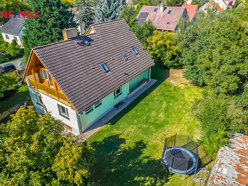 Rozlehlá zahrada o výměře 1 100 m² poskytuje dostatek soukromí i prostoru pro odpočinek. Oplocení z akátového dřeva garantuje dlouhou životnost bez nutnosti údržby. Praktickým doplňkem je velký krytý přístřešek pro dvě auta včetně vozu typu mikrobus.