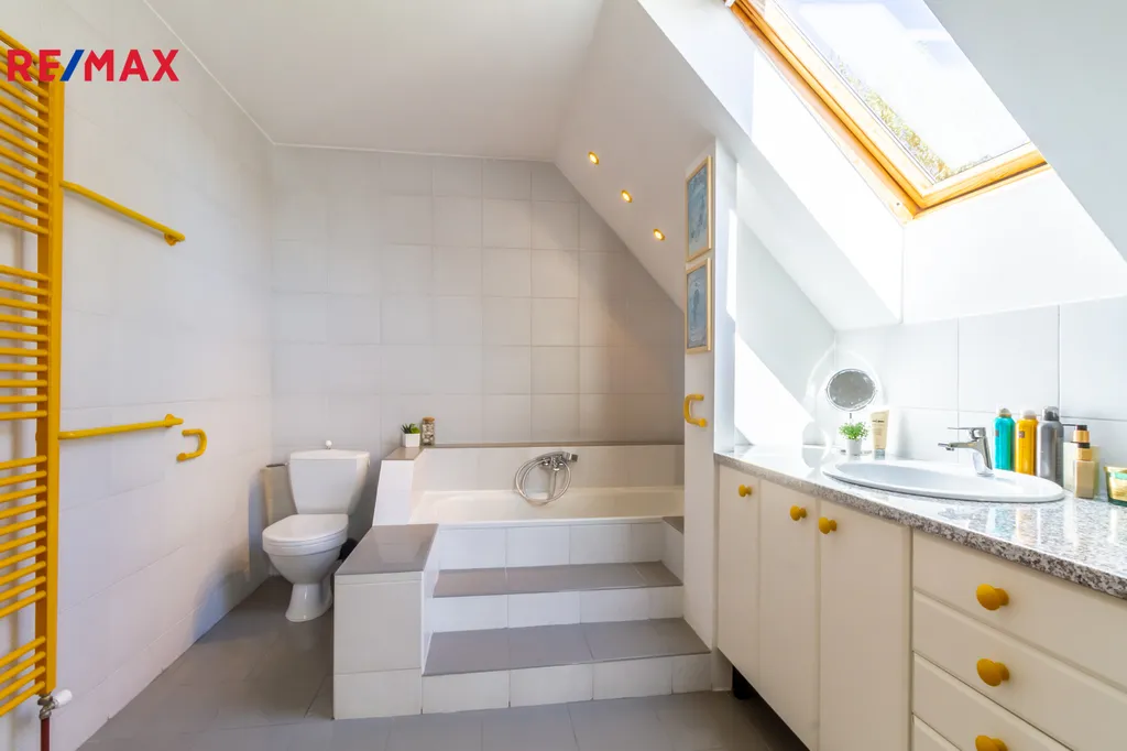 prostorná koupelna s vanou, dvouumyvadlem a WC