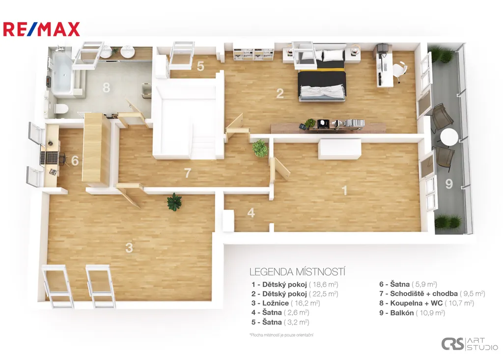 dva dětské pokoje, každý se šatnou a vstupem na balkon s výhledem do zahrady