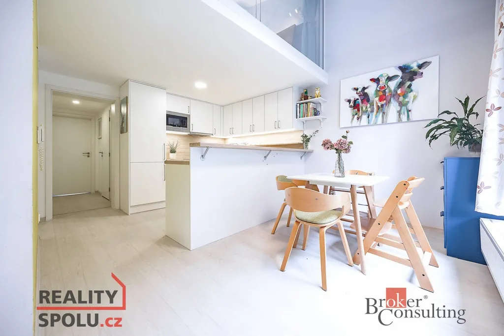 Jedná se o promyšleně řešený byt s 2 ložnicemi, pracovnou a velkorysým obývacím pokojem s velkou kuchyňskou linkou. Součástí bytu jsou i dvě koupelny (na každém patře jedna).