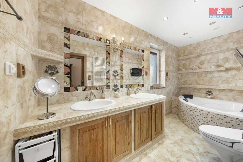 Nabízíme k prodeji prostorný vícegenerační rodinný dům s osmi místnostmi v klidné části Mostu. Tento jednopatrový dům o užitné ploše 411 m² je postaven na pozemku o rozloze 1355 m². Dům se pyšní atypickým řešením prostoru (5+kk, 3+kk a kancelářské prostory se samostatným vchodem), zastřešeným bazénem, vertikálním solariem a pečlivě udržovanou zahradou. K dispozici jsou dvě parkovací místa před oplocením, možnost parkování uvnitř a dvě garáže. Ložnice jsou vybavené klimatizací a na stropě fluorescenční výmalba s efektem noční oblohy. Obývací pokoj s krbem. Dům má ve všech oknech programovatelné hliníkové předokenní rolety a moderní kamerový systém se záznamem a přístupem třeba z mobilu. Topení a ohřev vody zajišťuje tepelné čerpadlo NIBE se zemním vrtem 2x100m, instalované v březnu 2024. Balkóny poskytují výhled na okolí. Ideální domov pro vícegenerační bydlení i s podnikáním v klidné části obce . Pro více informací neváhejte kontaktovat našeho makléře
