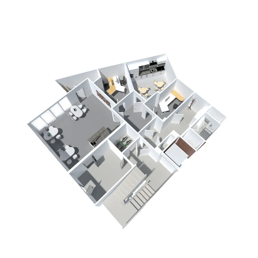 Dispozice nabízí několik místností včetně zázemí se sprchou, což zvyšuje variabilitu využití (ordinace, kosmetika, fyzioterapie, kanceláře, služby).