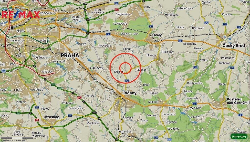 Výborná dojezdová vzdálenost do Prahy i na vlak. Dopravní spojení do Prahy - PID nebo vlakové spojení z Praha - Klánovice -> Praha - Masarykovo nádraží trvá jen 26 min., nebo Říčany -> Hlavní nádraží trvá jen 25 min., vše v pravidelných intervalech. Bus PID je 500 m od domu a jezdí na metro B Černý most. Klánovice, Uhříněves i Říčany 6 km, Průhonice - Čestlice 10 km.