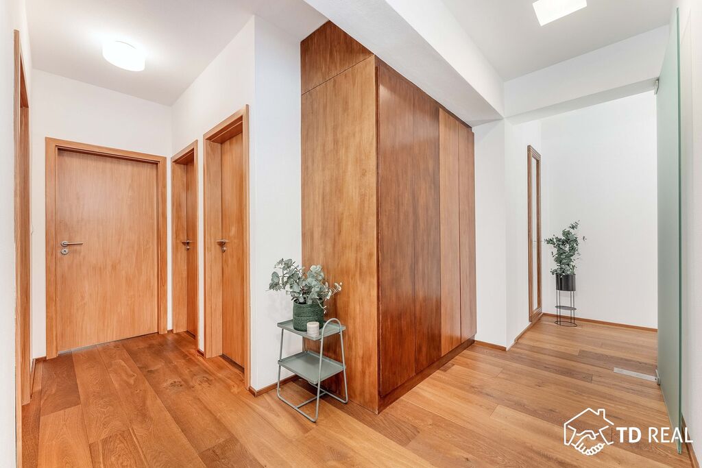V interiéru se dbalo na kvalitu – podlahy jsou masivní dubové, což dodává bytu nadčasový vzhled i příjemnou atmosféru.