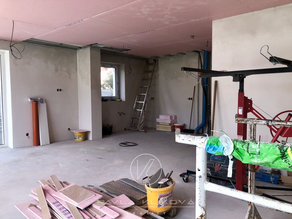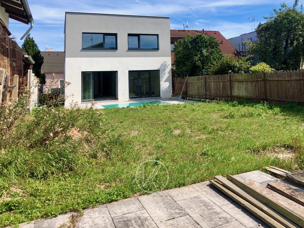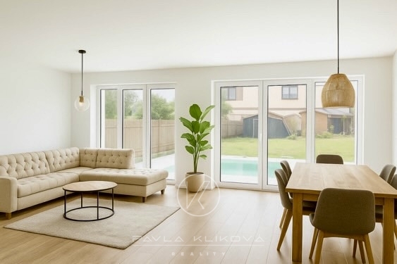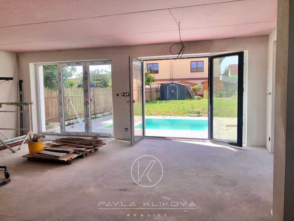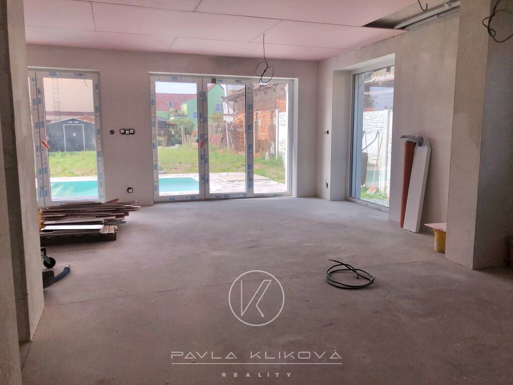 Moderní rodinný dům s bazénem, velkými francouzskými okny a možností dokončení podle vašeho vkusu. Prodej novostavby moderního rodinného domu s bazénem  5+kk, 129 m2, který je postaven na pozemku o výměře 349 m2 v Havlíčkově ulici v Tlučné. Dům je těsně před dokončením, můžete tedy ještě ovlivnit výběr podlah, obkladů, dveří a sanity.