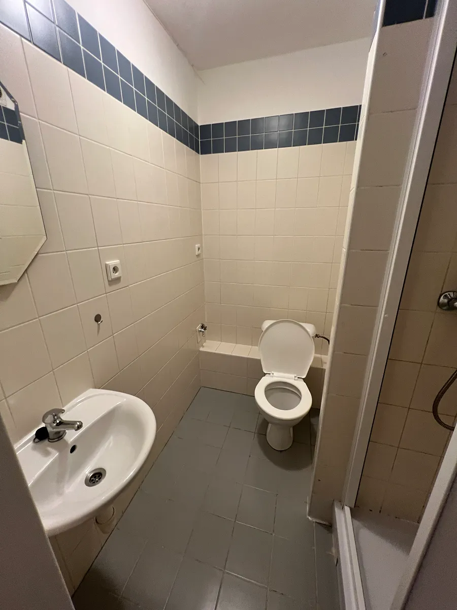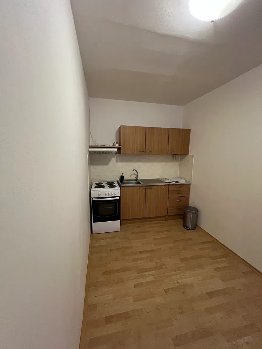 Dispozice bytu se skládá z malé předsíně, ze které je vstup do koupelny, která je vybavena sprchovým koutem, umyvadlem a WC. Z předsíně se lze dále dostat do hlavní obytné místnosti, resp. kuchyně s obývacím pokojem/ložnicí. Kuchyň je vybavena sporákem, který zahrnuje varnou desku a troubu, a je doplněna o digestoř. Byt je nezařízený a je k dispozici ihned. Parkování pro rezidenty možné před domem.