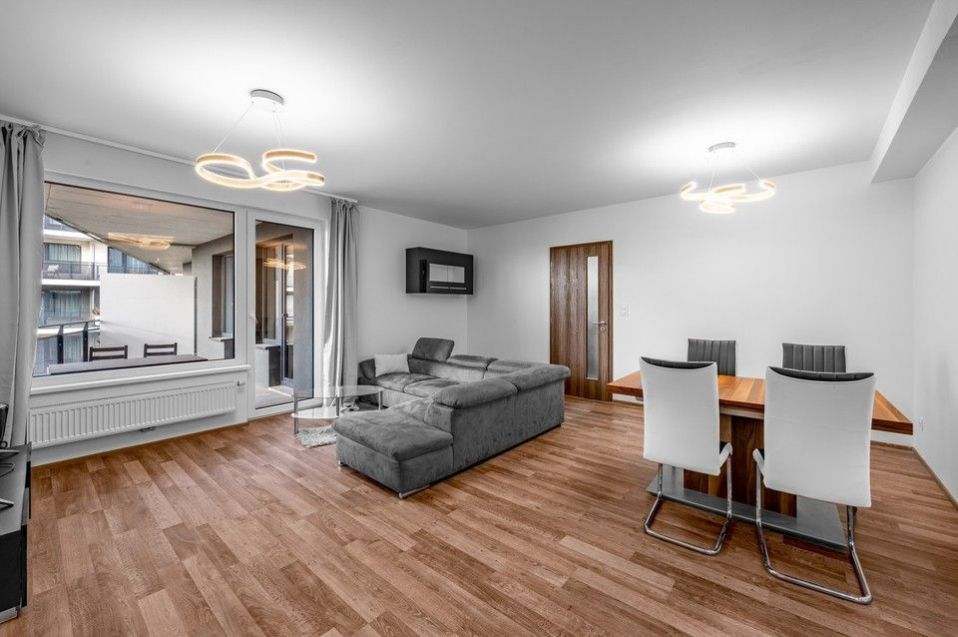 Pronájem bytu 3+kk (90 m2) s prostorným balkonem (16m2), parkovacím místem v garáži a sklepem.