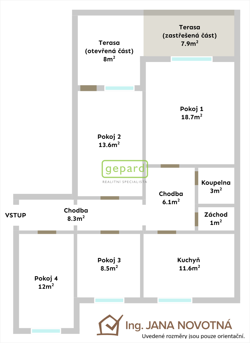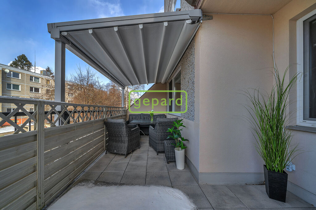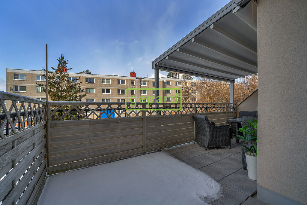 * Velká terasa 18 m² do klidného vnitrobloku, částečně zastřešená – ideální pro snídaně venku i večerní grilování