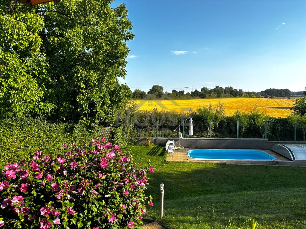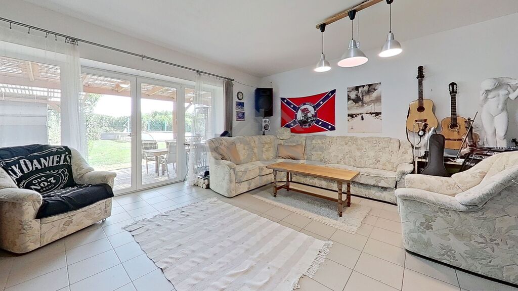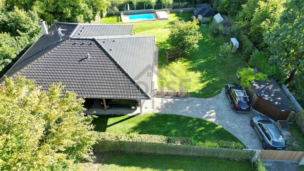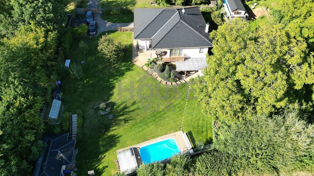 Součástí domu je venkovní bazén, sauna, kryté stání pro auto a prostorná zahrada se vzrostlou zelení. Dům je napojen na obecní vodovod, má vlastní čističku odpadních vod a vlastní studnu. Do konce roku bude připojen na obecní kanalizaci, což dále zvyšuje komfort a hodnotu nemovitosti.