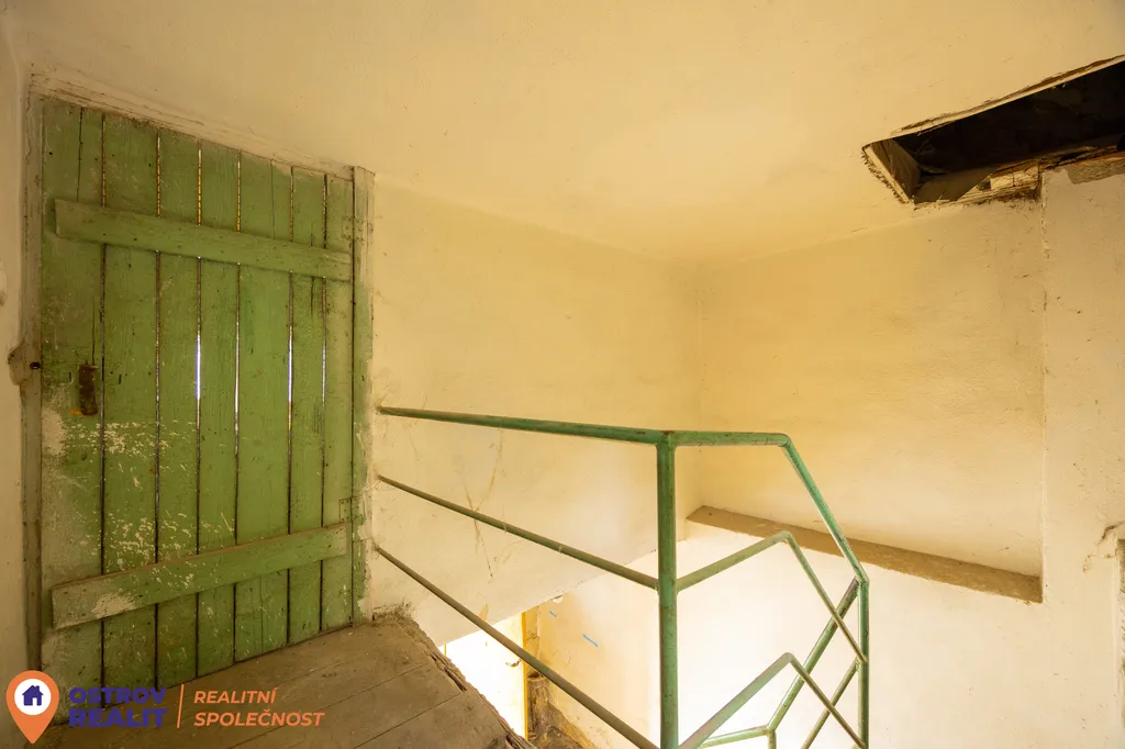 Dům je již částečně připravený na rekonstrukci – ve spodním patře jsou osekané omítky, vybraná podlaha a prostor je nachystaný pro novou realizaci.