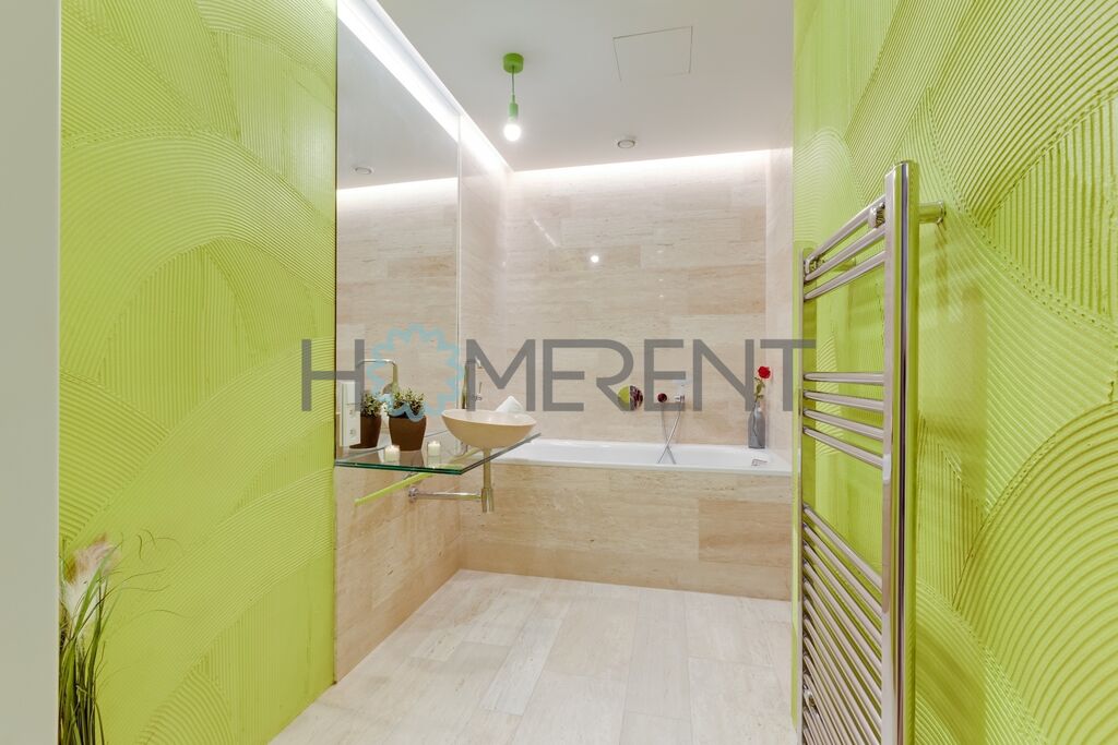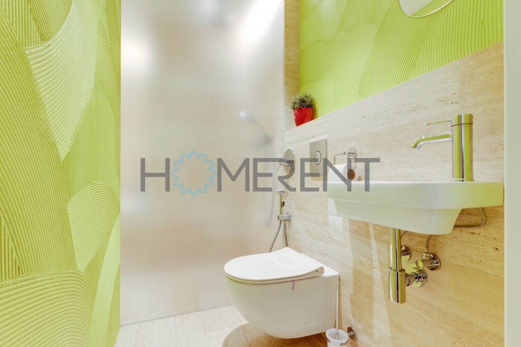Koupelna je navržena ve světlém a elegantním stylu a nabízí jak prostornou vanu, tak i praktický sprchový kout. V chodbě bytu se nachází velké množství vestavěných úložných skříní, které zajistí, že budete mít vše přehledně uspořádané. Právě zde je také umístěna pračka se sušičkou.