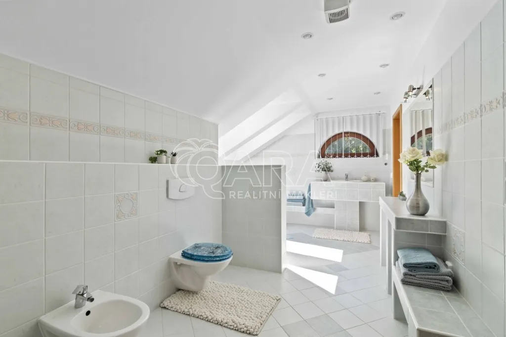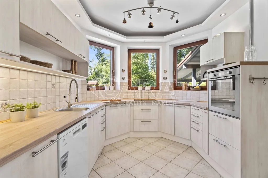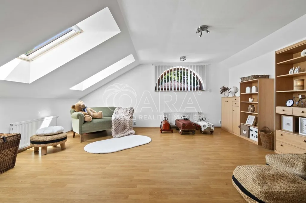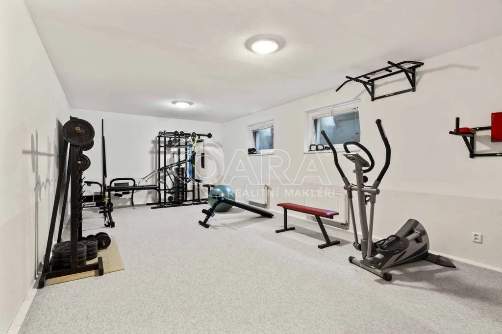 Pozemek o rozloze 1748 m obklopený lesem je víc než jen místo k posezení. Bazén, vířivka, pergola, venkovní krb s posezením, malé dětské hřiště, a pokud vám nestačí téměř čtyřicetimetrová uzavřená dvougaráž, protože máte trochu větší vozový park nebo třeba karavan, vejdete se na pozemek pohodlně i s vašimi dalšími motorovými mazlíčky. Všechno tu má svoje místo.