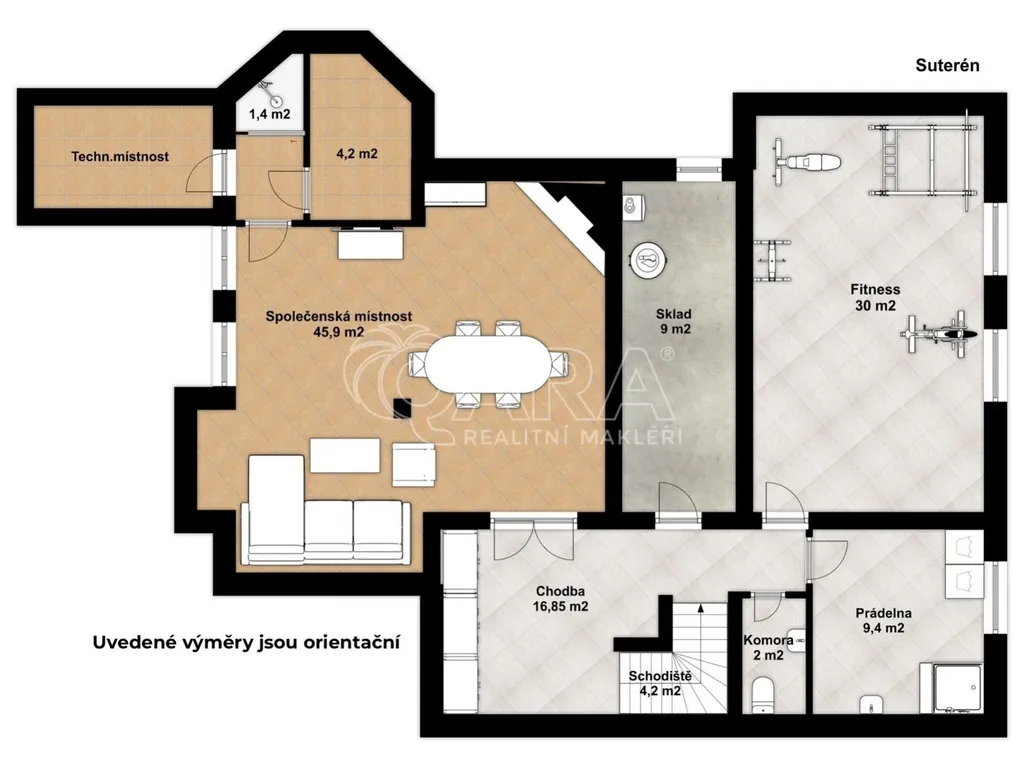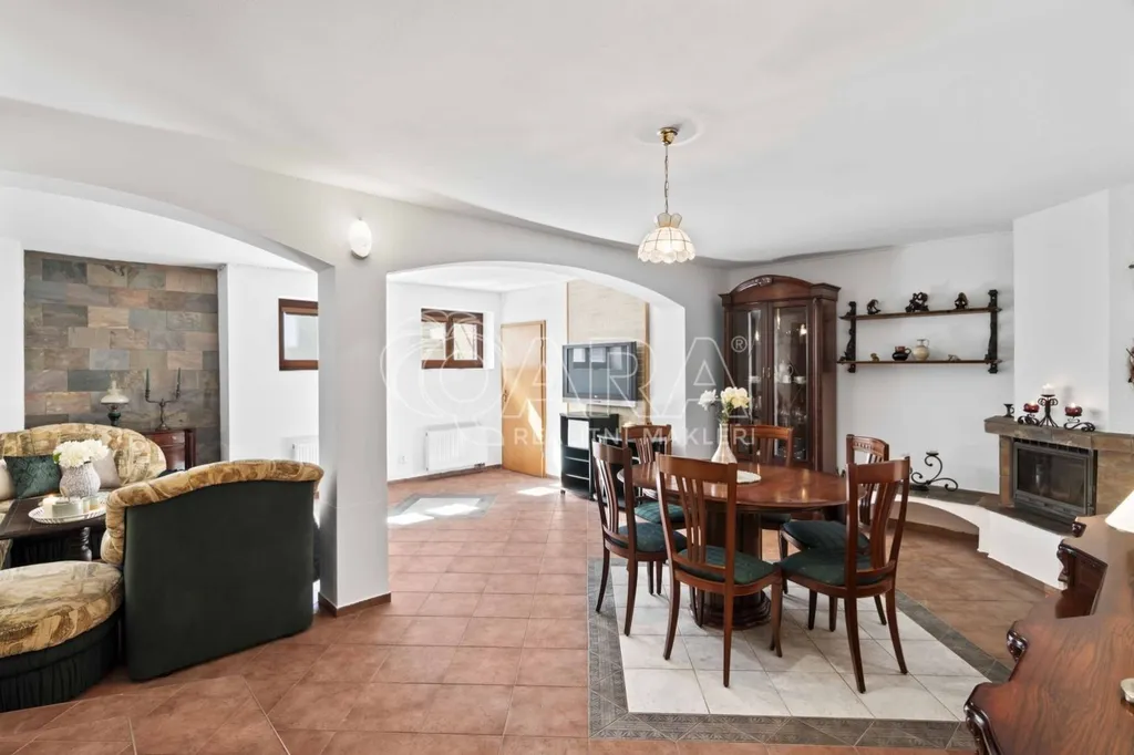 Uvnitř vás čeká pět samostatných a prostorných ložnic, více než šedesátimetrový obývací pokoj, rozdělený na klidovou a společenskou zónu s kulečníkovým stolem a krbem a v suterénu najdete ještě i fitness a společenskou místnost, kde se potkává rodina i přátelé.