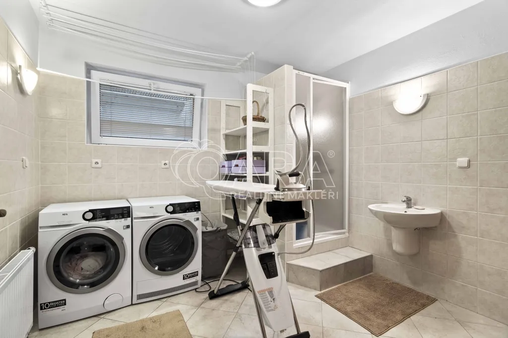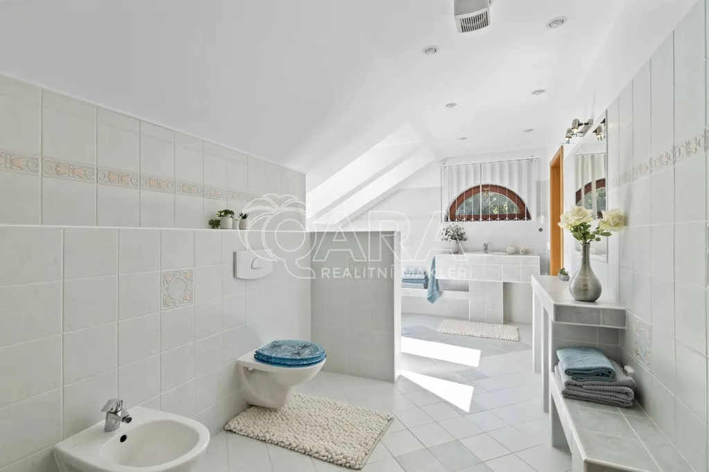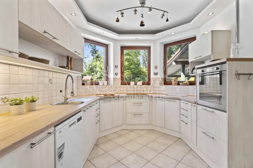 Pozemek o rozloze 1748 m² obklopený lesem je víc než jen místo k posezení. Bazén, vířivka, pergola, venkovní krb s posezením, malé dětské hřiště, a pokud vám nestačí téměř čtyřicetimetrová uzavřená dvougaráž, protože máte trochu větší vozový park nebo třeba karavan, vejdete se na pozemek pohodlně i s vašimi dalšími motorovými mazlíčky. Všechno tu má svoje místo.