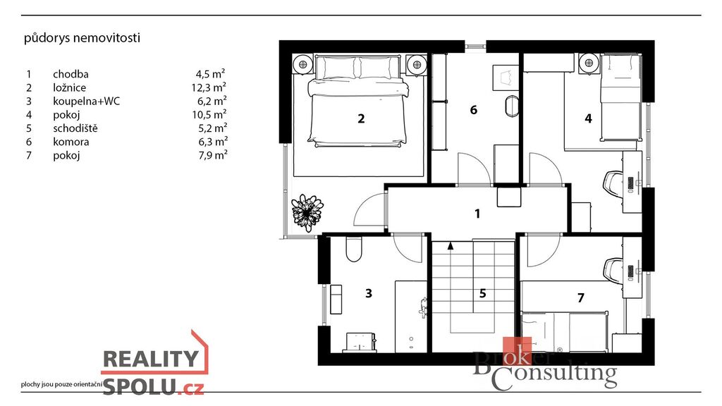 • Celkem pět obytných místností poskytuje flexibilitu – ložnice, dětské pokoje, pracovna či pokoj pro hosty.