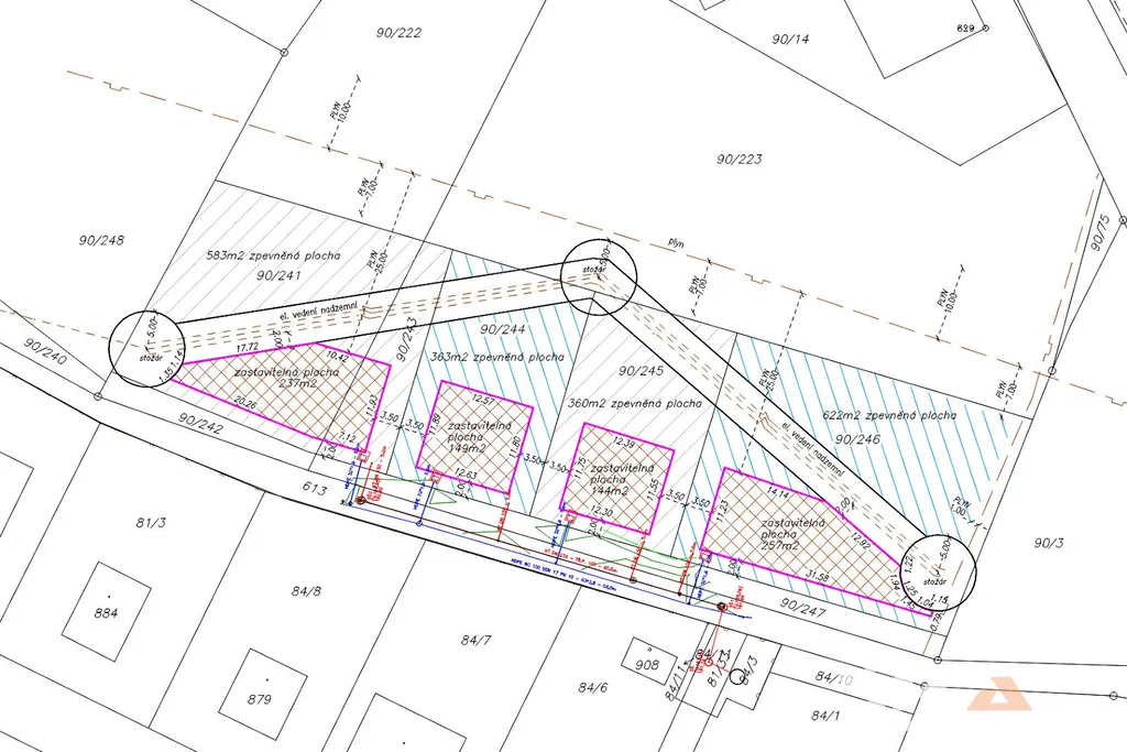 Nabízíme k prodeji 4 stavební pozemky nacházející se v obci Dobroměřice u Loun, v lokalitě s místopisným názvem „Na Mořině“. Pozemky jsou rovinaté, mají převážně obdélníkové půdorysy a následující výměry: pozemek označený jako č.1: 1.065 m2, č.2: 603 m2, č.3: 596 m2 a č.4: 1.201 m2. Pozemky mají vybudovánu přípojku elektrické energie zakončenou na hranici pozemků, vodovodní přípojku zakončenou ve vodoměrné šachtě umístěné na pozemku a kanalizační přípojku zakončenou na pozemku. Při západní hranici pozemku č.1 plánuje obec Dobroměřice vybudovat park. Přes pozemky prochází nadzemní vedení vysokého napětí, přičemž v rozích pozemků č.1 a č.4 jsou umístěny sloupy vysokého napětí. Pozemky jsou dotčeny ochranným pásmem nadzemního vedení vysokého napětí a dále ochranným pásmem plynovodu. Detailní informace ohledně možnosti zastavění pozemků, ochranných pásmech a regulativách výstavby poskytneme při osobní prohlídce nebo v RK.