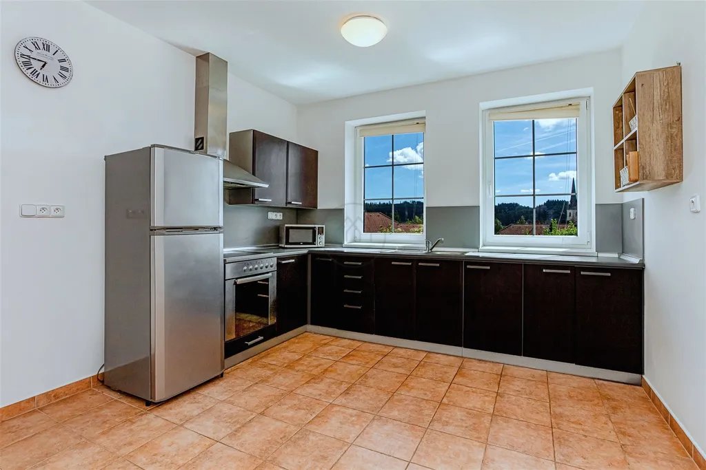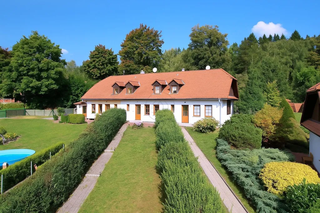 Jednotka o dispozici 4+kk s podlahovou plochou 122 m² je součástí udržovaného řadového domu a nabízí ideální zázemí pro rodinnou rekreaci, ale také zajímavý potenciál pro budoucí pronájem. V přízemí vás přivítá zádveří, technická místnost a samostatné WC. Hlavní obytný prostor tvoří světlý obývací pokoj s kuchyňským a jídelním koutem, odkud je vstup na prostornou terasu a zahradu, s výhledem do klidné zeleně. Podkroví disponuje třemi ložnicemi a koupelnou, čímž poskytuje dostatek prostoru pro rodinu i hosty.