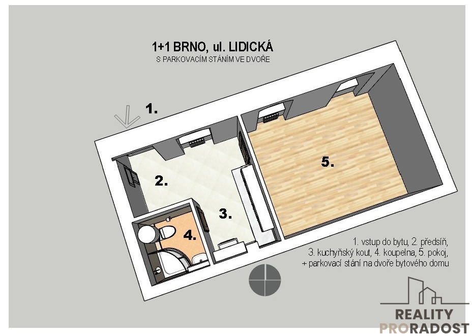 Nabízíme pronájem nezařízeného bytu 1+1 v centru Brna na ul. Lidická, ve 2.NP cihlového pavlačového domu o výměře 34 m2. Z vybavení je v bytě kuchyňská linka, lednička a pračka. Koupelna se sprchovým koutem a toaletou dohromady, vlastní el. vytápění, ohřev vody boilerem. V pokoji plovoucí podlaha, v kuchyni a koupelně dlažba. Vhodné pro 1-2 osoby, volné ihned. Záloha na inkaso činí 4.000,- Kč. Vratná kauce jedno měsíčná nájemné vč. inkasa, provize jedno měsíční nájemné.
