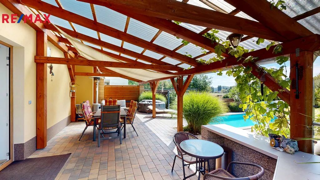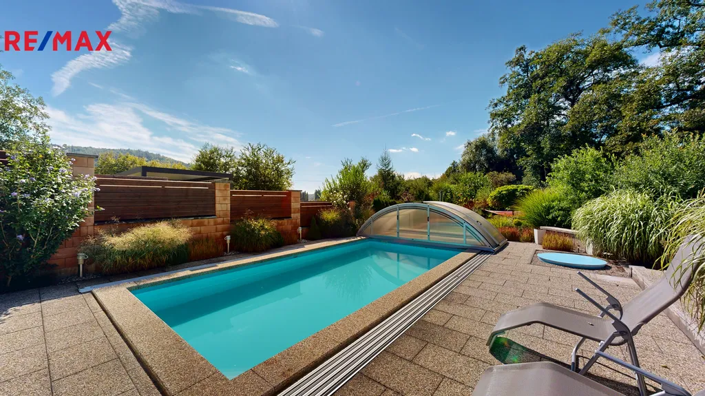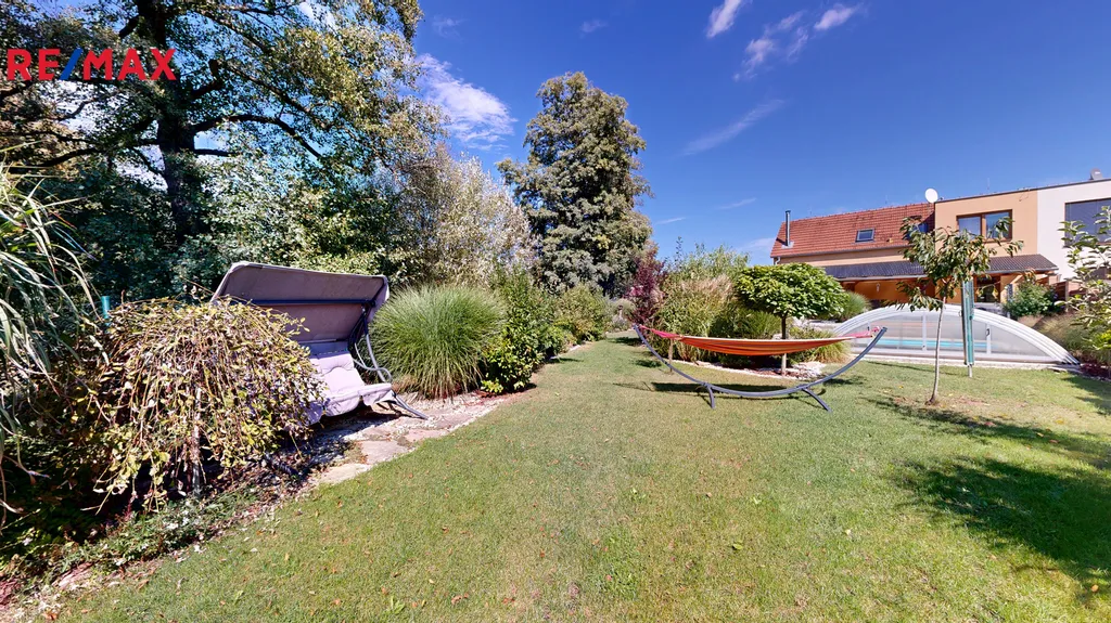 Na okrasné zahradě o výměře 306 m2 se nachází krytý bazén Albixon z roku 2020, o objemu 32 m3 ( hloubka 1,2 m, rozměry 3,5 x 7,5 m), na níž navazuje další část zahrady o výměře 500 m2, která je v dlouhodobém pronájmu od obce. Dále se na pozemku nachází kryté parkovací místo na auto o výměře 20 m2 a 2 zahradní domky na nářadí.