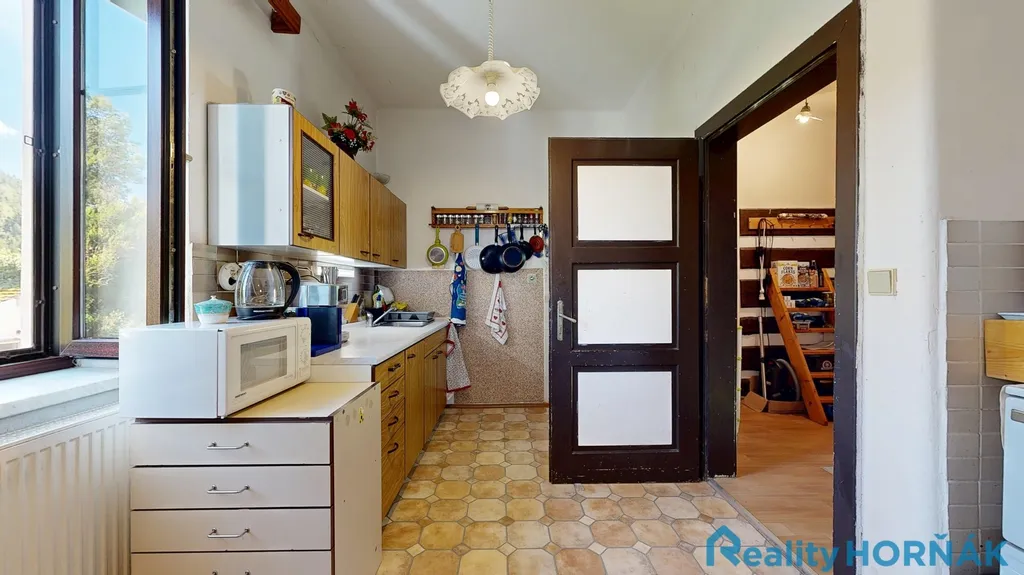 Po dřevěném schodišti vystoupáme na horní chodbu (5,9 m2), ze které vstupujeme do samostatných místností: kuchyně (13,0 m2), jídelny (15,5 m2), obývacího pokoje (27,6 m2), a ložnice (9,8 m2). Z horní chodby můžeme dále vystoupat do dosud nevyužívaného půdního prostoru (79,6 m2), kde lze současnou dispozici domu dále rozvíjet. Ze spodní chodby sestupujeme do klenutého sklepa (17,5 m2). Zahrada za domem nabízí vedlejší stavby: dílnu (14,3 m2), se skladem zahradního nábytku (1,4 m2) a stodolu (63,7 m2), se zastřešeným dřevníkem (13,0 m2).