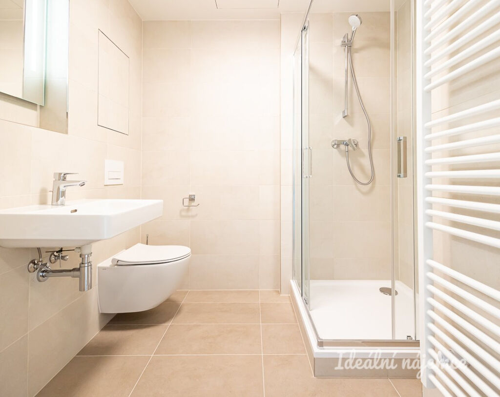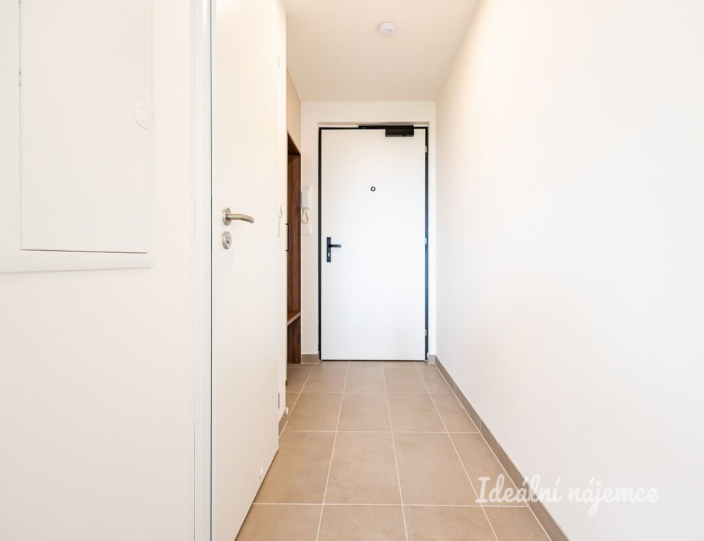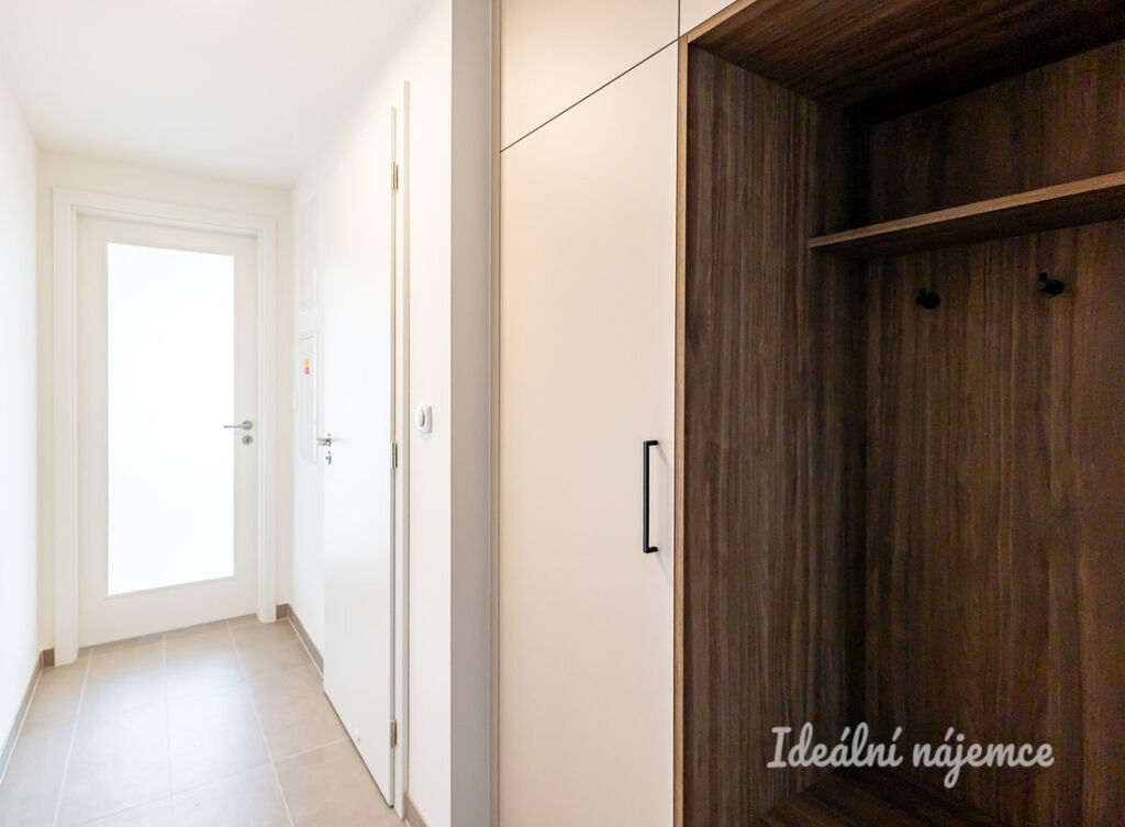 V předsíni se nachází vestavěná šatní skříň s věšákem. Z předsíně se dostaneme do obývacího pokoje s kuchyňským koutem. Kuchyně se nabízí plně vybavena vestavnými spotřebiči - lednice s mrazákem, myčka nádobí, indukční varná deska, elektrická trouba a digestoř značek Electrolux a Liebherr. Obývací pokoj je nezařízen. V koupelně se nachází sprchový kout, závěsná sanita a přípojka s vývodem na pračku. Okna jsou zde kvalitní trojskla s výbornou tepelnou i zvukovou izolací.