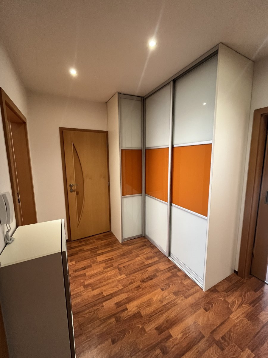 Při vstupu do bytu uvidíte prostornou chodbu s úložným prostorem a vstupy do jednotlivých místností. Dispozice nabízí velkou koupelnu s umyvadlem, vanou, místem pro pračku. Toaleta se nachází zvlášť a je tu k dispozici také umyvadlo.