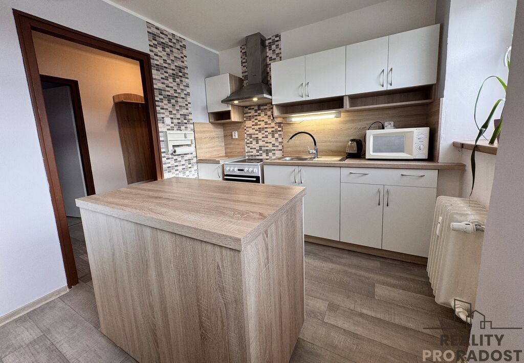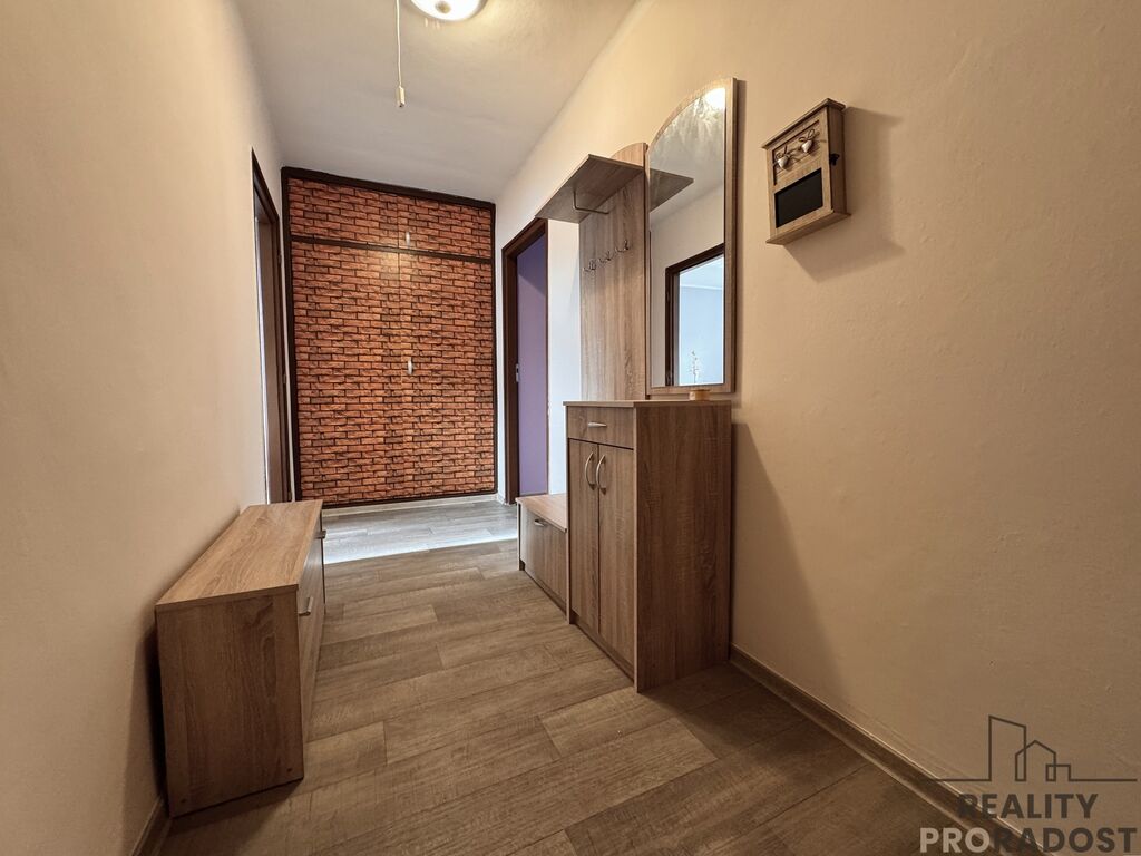 Byt je částečně zařízený – k dispozici je jídelní stůl se židlemi, šatní skříně a komoda, takže se můžete pohodlně nastěhovat a doplnit si vybavení podle vlastních představ. Dispozice nabízí samostatnou kuchyň s jídelním koutem a komorou, obývací pokoj/ložnici.