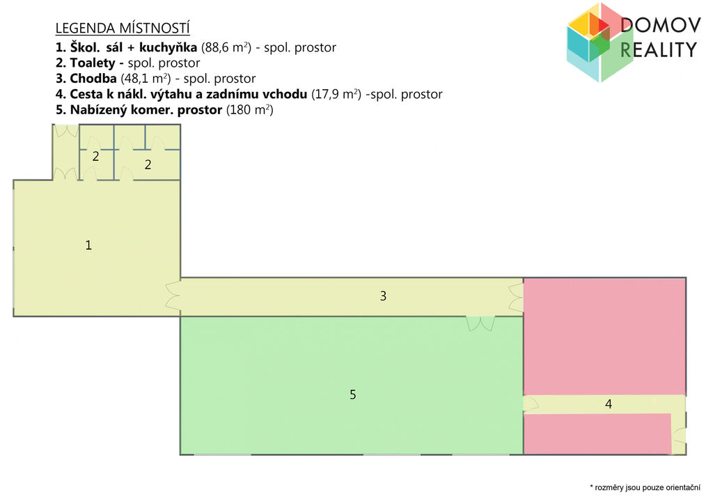 Kromě haly nájemce může používat dvoje společné toalety a velkou místnost (88,6 m2) s vybaveným kuchyňským koutem. Po domluvě lze tento prostor využívat jako školící místnost, jsou tam k dispozici židle, stoly i tabule.