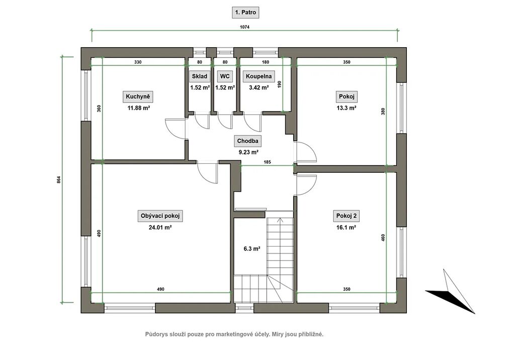 Do patra vede pohodlné, prostorné schodiště.