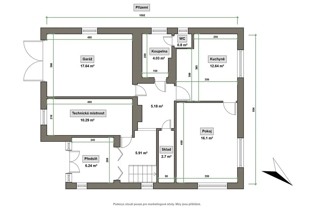 Přízemí o CP cca79m² Vám nabízí: jeden neprůchozí pokoj, kuchyni s jídelnou, koupelnu, samostatné WC, sklad.Nedílnou součástí přízemí je veliká garáž, technická místnost a předsíň.