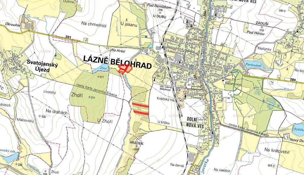 Pozemky mají celkovou rozlohu 22 816 m2. Zapsány jsou na LV 2823 pod parcelními čísly 313/8, 338/2, 348/3 a 413/27 v KÚ Lázně Bělohrad.