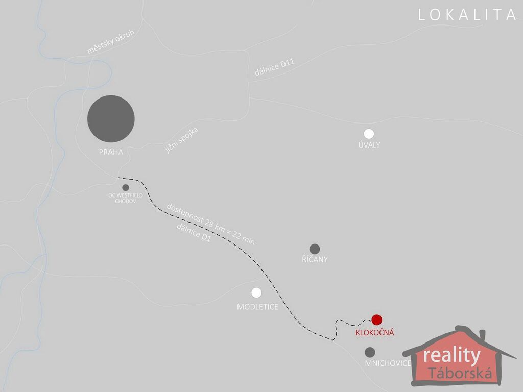 V okolí novostavby je zastavěné stabilizované území, bez možnosti další výstavby do budoucna. Vzdálenost 8 min. autem do Říčan u Prahy a 30 min. do centra Prahy.