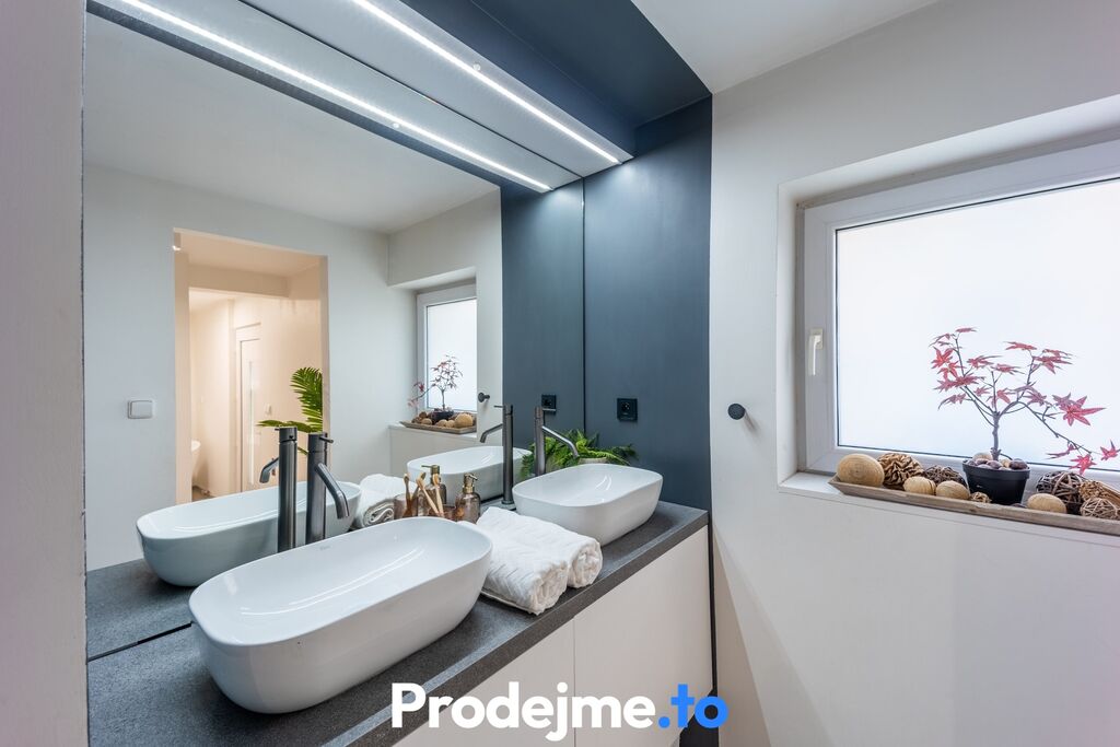 Koupelna je chytře členěná do čtyř částí – najdete tu zděný sprchový kout, dvě umyvadla, toaletu a samostatnou místnost s volně stojící vanou. Pro lepší představu nahlédněte do 3D půdorysů v galerii.