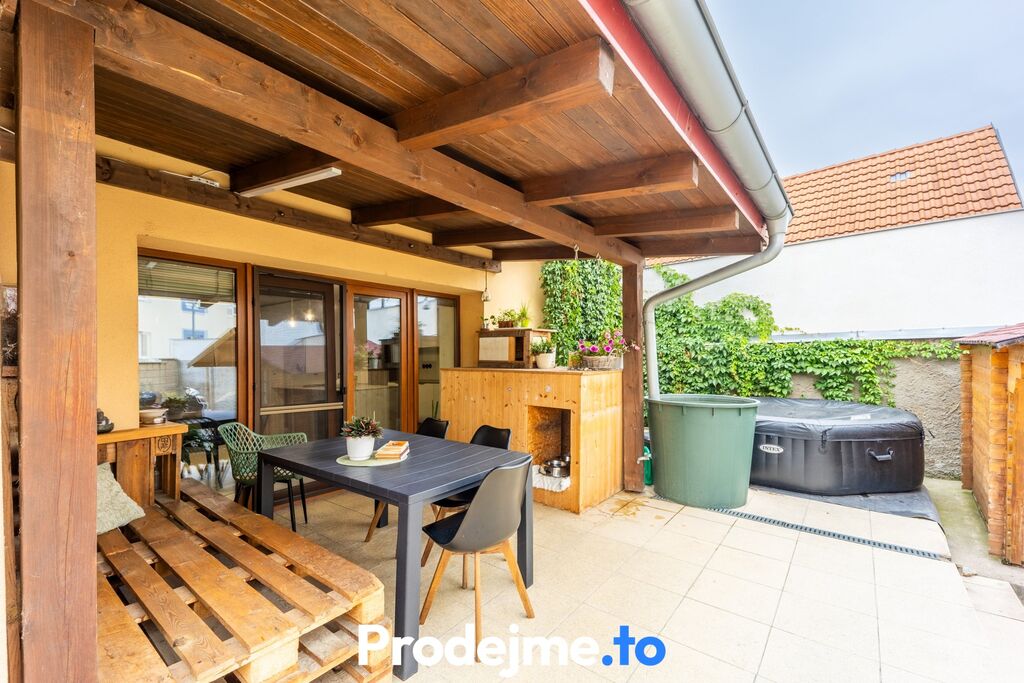 Skvělá lokalita, stylový interiér s praktickými úložnými prostory a příjemný dvorek se zastřešenou terasou a vířivkou! Sem se můžete rovnou nastěhovat, v domě totiž zůstává veškerý nábytek i spotřebiče - kromě pračky a sušičky.