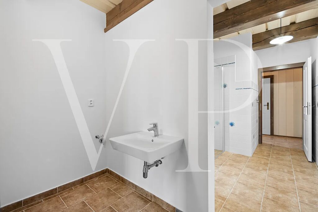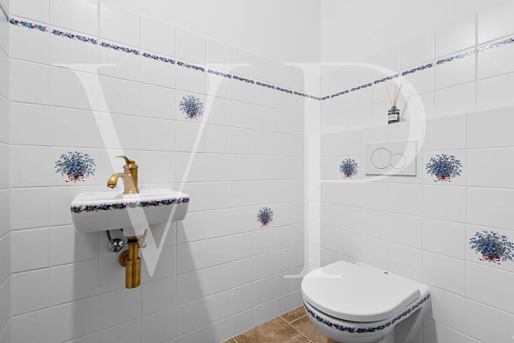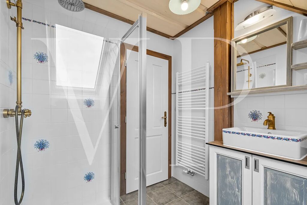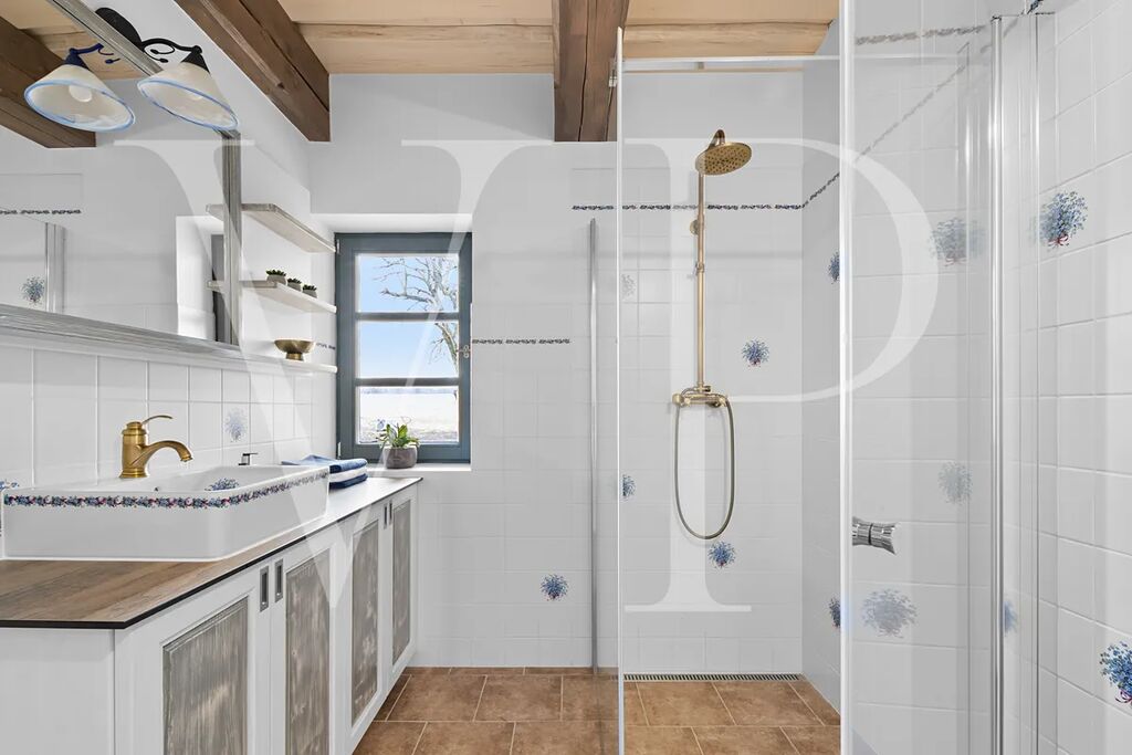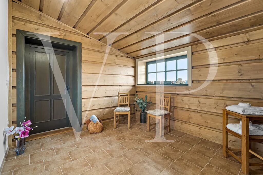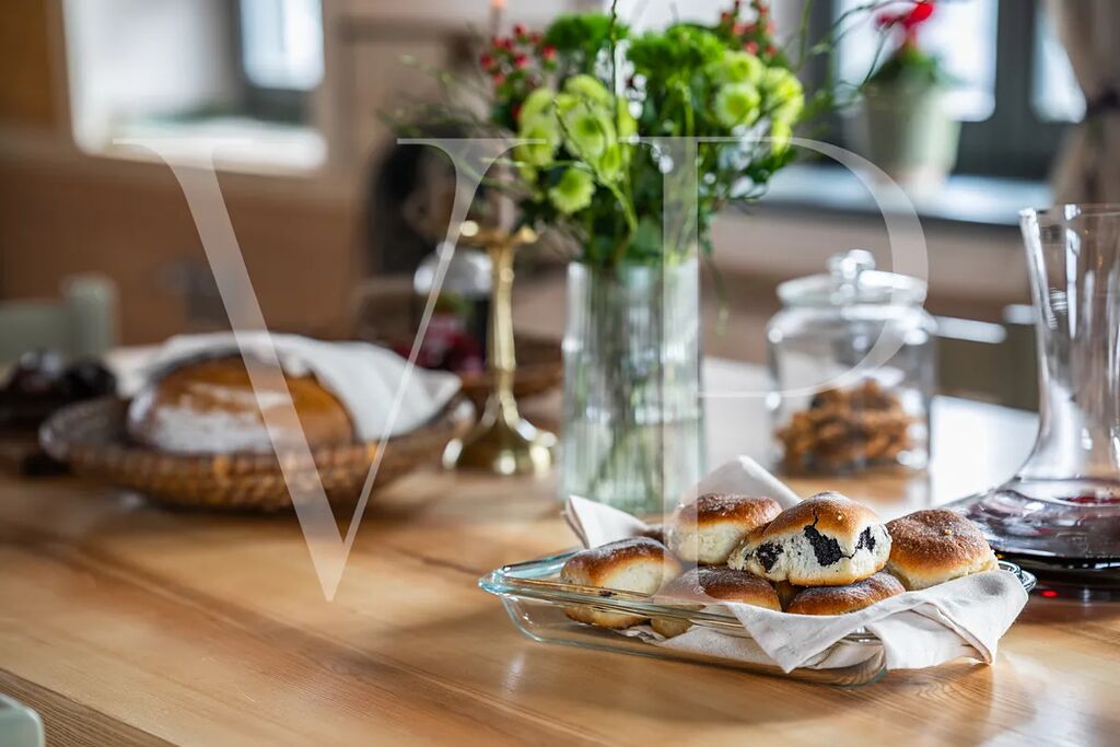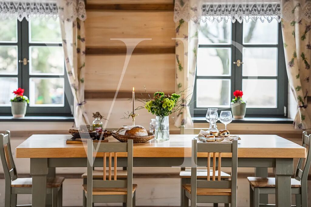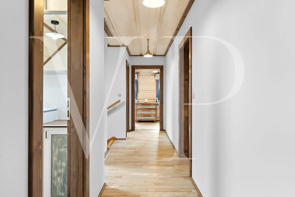 V interiéru narazíte pouze na luxusní zakázkovou truhlářskou práci. Schodiště, kuchyně s vestavěnými spotřebiči v retro edici a deska jídelního stolu jsou z jasanu, pokoje jsou vybavené masivním smrkovým nábytkem. To vše dolaďují k dokonalosti kvalitní dlažba, obklady, designová sanita a moderní dobové prvky jako jsou keramické vypínače, kliky a svítidla.