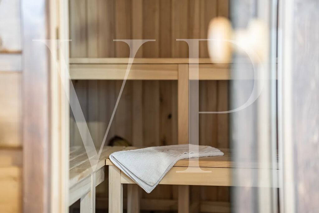 V přízemí se nachází zádveří (5,3 m²) s šatnou (5,1 m²), vstupní chodba (10,25 m²), toaleta (1,45 m²), koupelna se sprchovým koutem (6,8 m²), tech. místnost (4,0 m²), relaxační zóna s finskou saunou (15,2 m²), obývací pokoj s kuchyňským koutem (43,9 m²), ložnice (17,2 m²) a krytá terasa (24,5 m²).