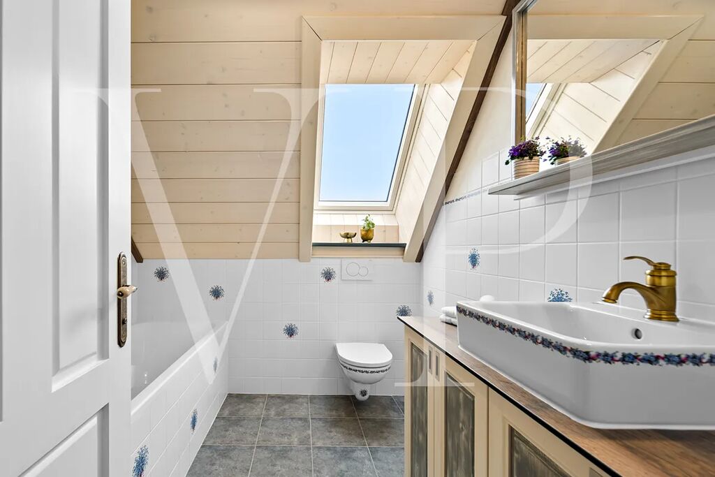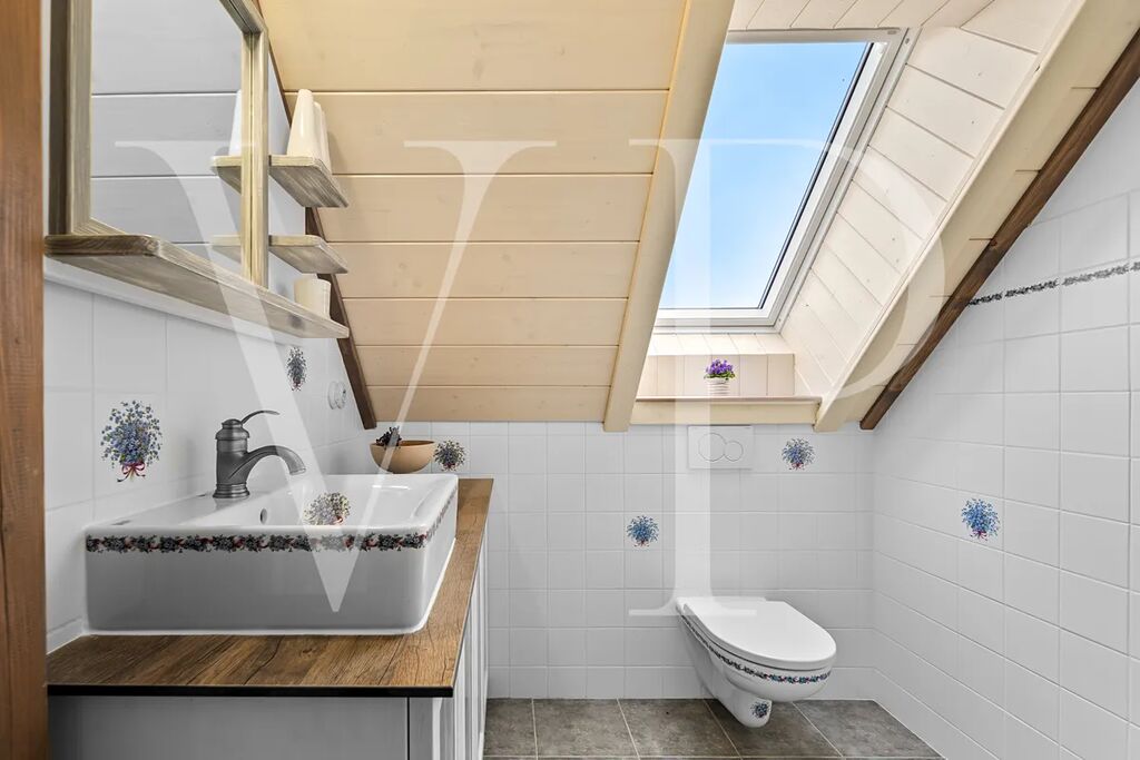 V patře se dále nachází 3 útulné světlé ložnice, dvě koupelny a prostor pod střechou vhodný například pro pracovnu a nebo dětskou ložnici s celkovou podlahovou plochou cca 78 m².