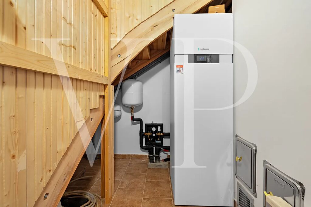 Zdrojem vody je vlastní vrt na pozemku, v technické místnosti je umístěná čistička vody. Odpady jsou svedené do ČOV a teplo a ohřev vody zajistí zemní tepelné čerpadlo. Druhým, přírodním zdrojem tepla jsou tradiční kachlová kamna s pecí. Po celém přízemí je rozvedené podlahové topení a v pokojích jsou umístěné radiátory.