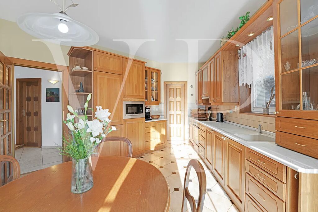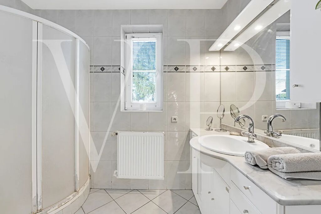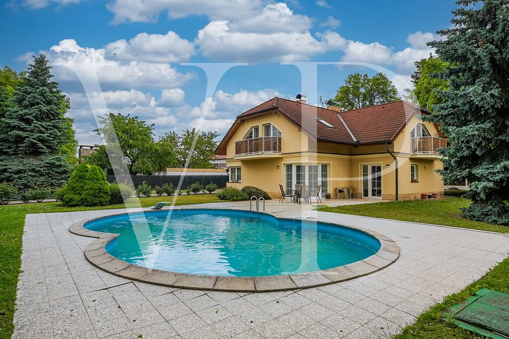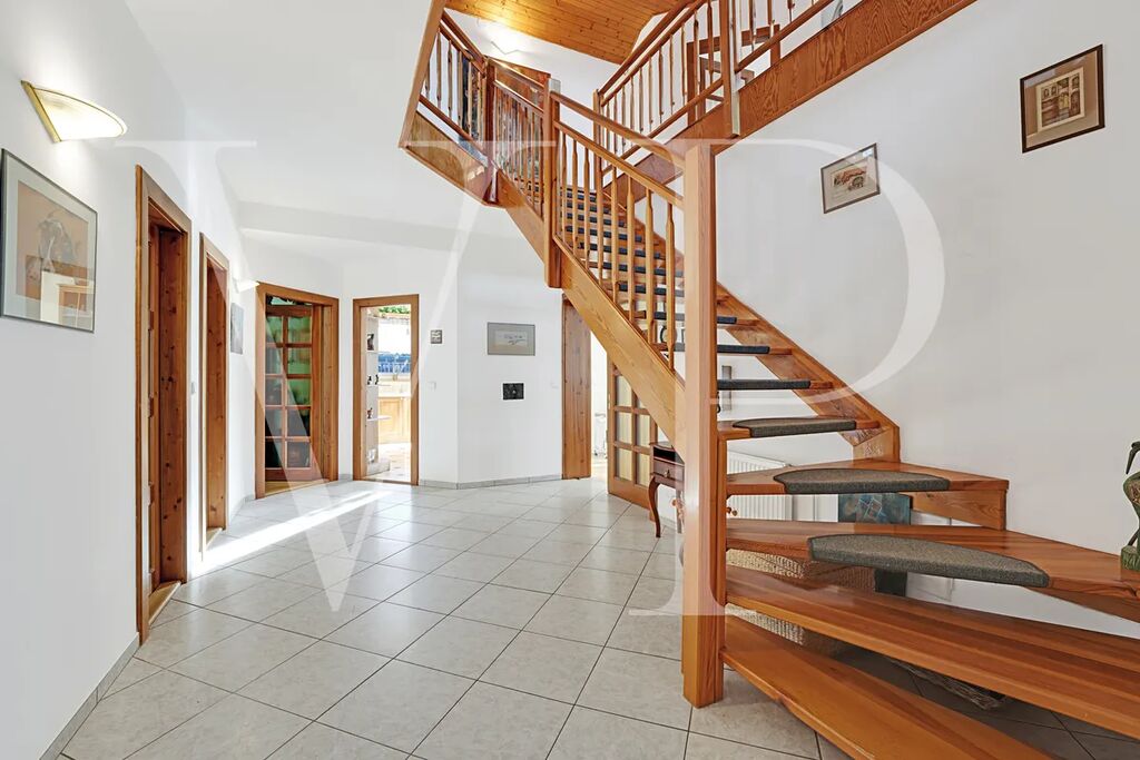 Cihlový rodinný dům se prodává kompletně vybavený a jeho celková podlahová plocha je 350 m2 s dispozicí 6+1 se třemi koupelnami, toaletami a domácím wellness.