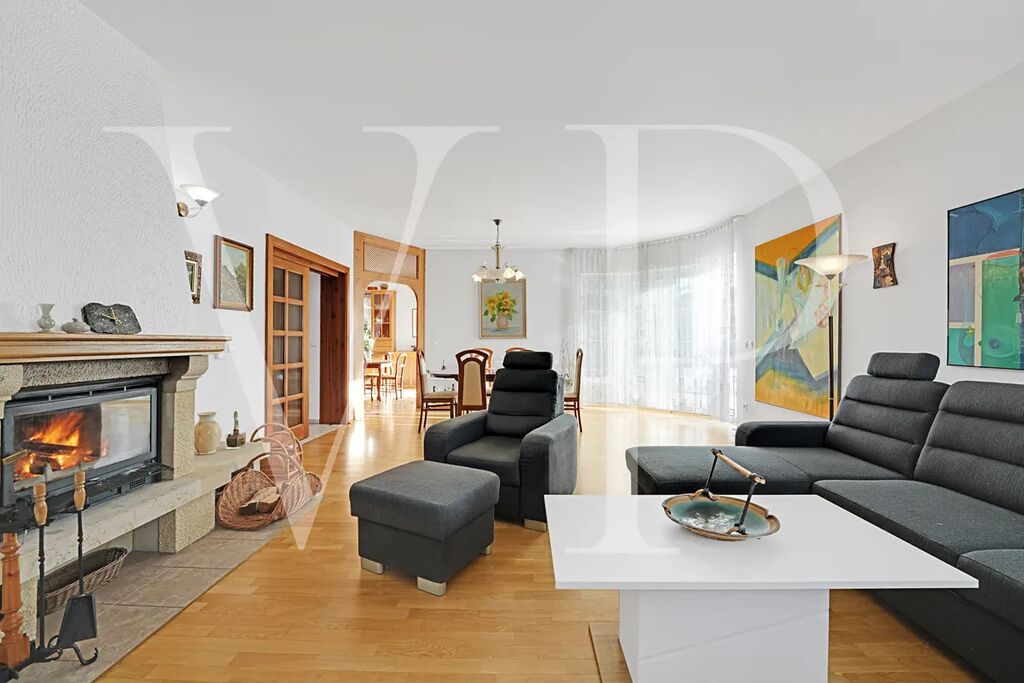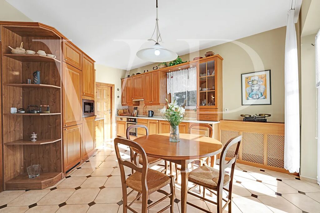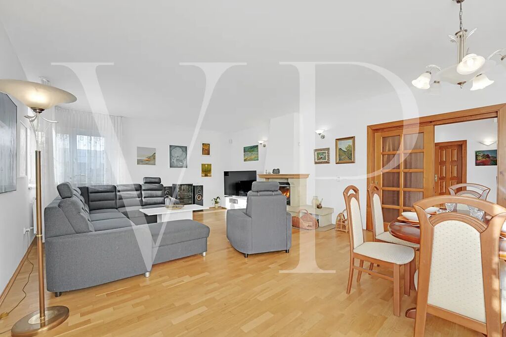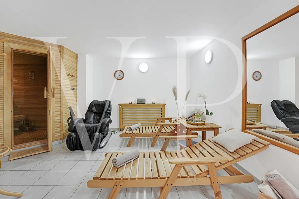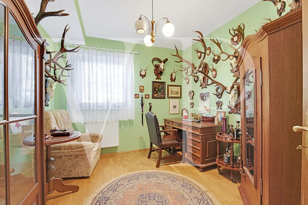 Cihlový rodinný dům se prodává kompletně vybavený a jeho celková podlahová plocha je 350 m2 s dispozicí 6+1 se třemi koupelnami, toaletami a domácím wellness.